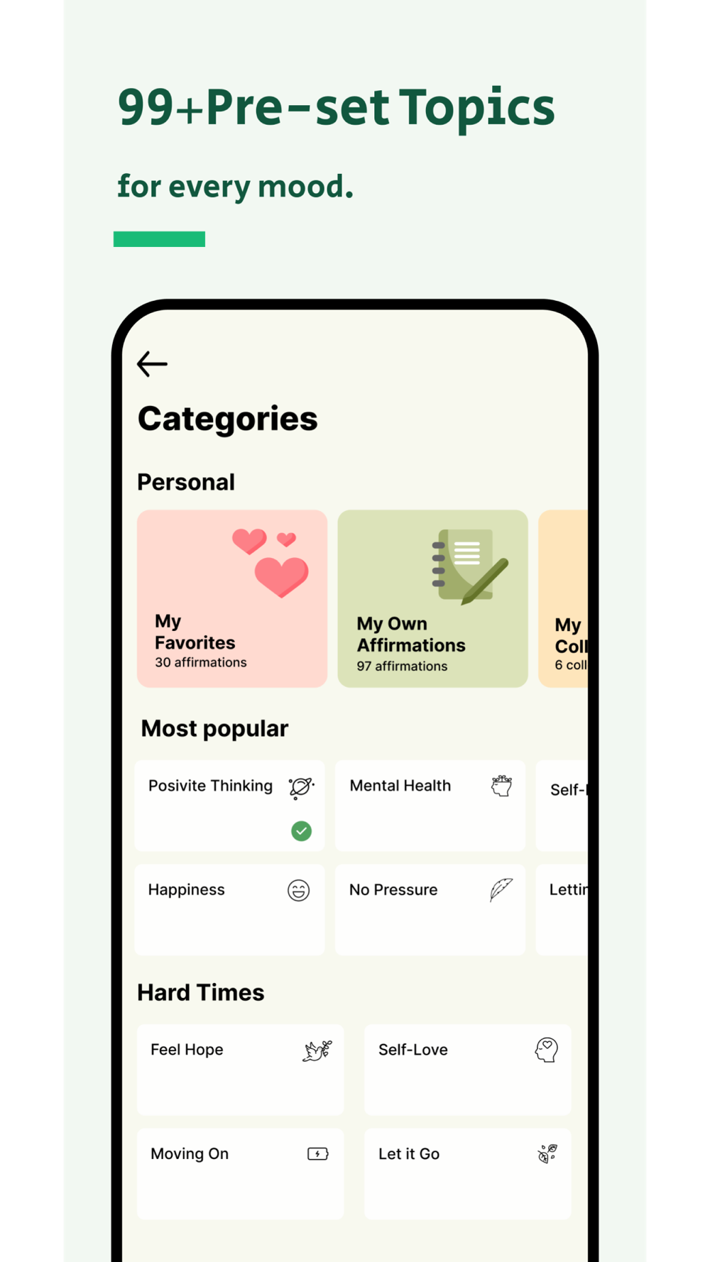 - **Mood Booster**: Feeling down? Our mood-lifting affirmations are here to turn your frown upside down.