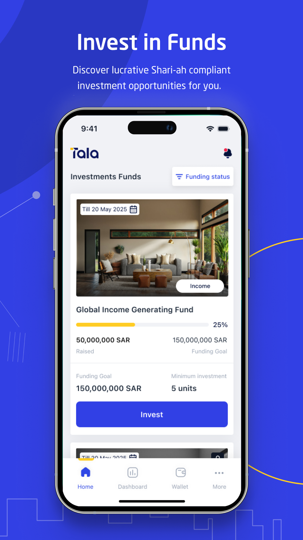 Tala is a digital investment platform powered by a closed joint-stock company fully authorized by the Capital Market Authority (CMA), License No 37-08116 since 2009. Aligned with the objectives of the Financial Sector Development Program under Saudi Vision 2030, Tala enables Saudi citizens and residents to invest in exclusive local and international investment opportunities.