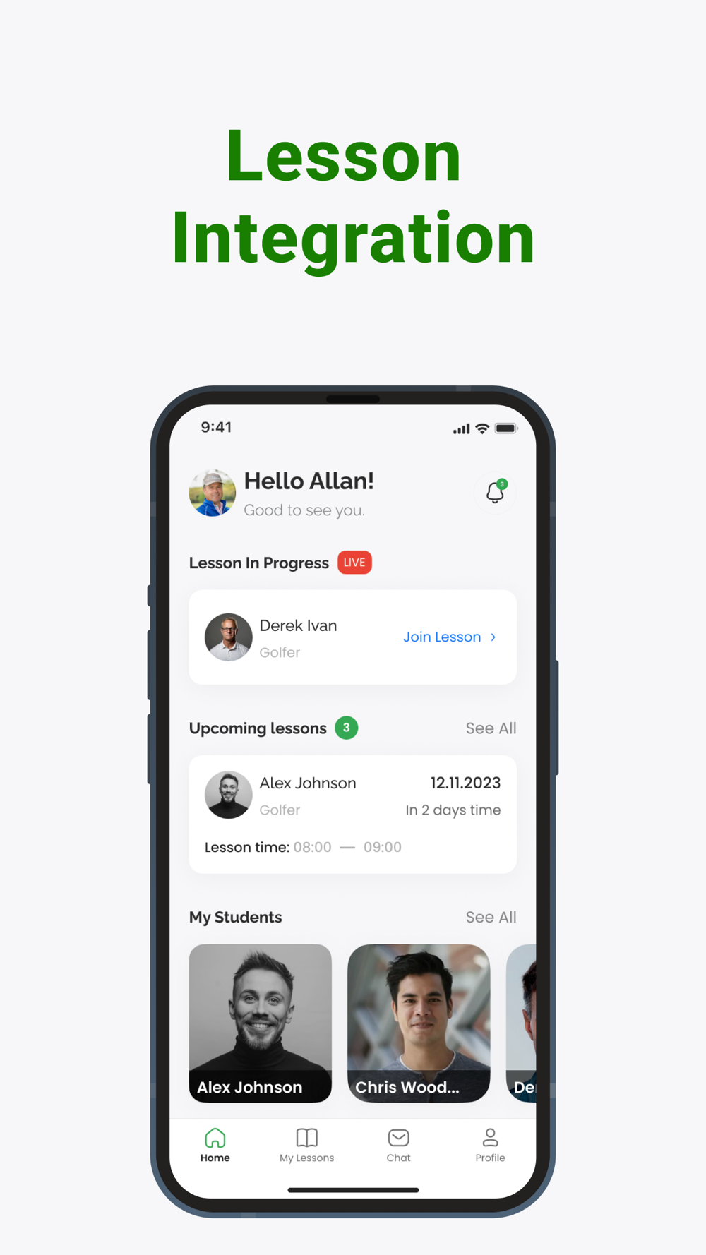 Create a profile, select live lessons and be connected with a live Golf Live coach who will evaluate your swing and improve your golf game. With Golf Live you can schedule a lesson in advance and favorite coaches you want to be connected with again.