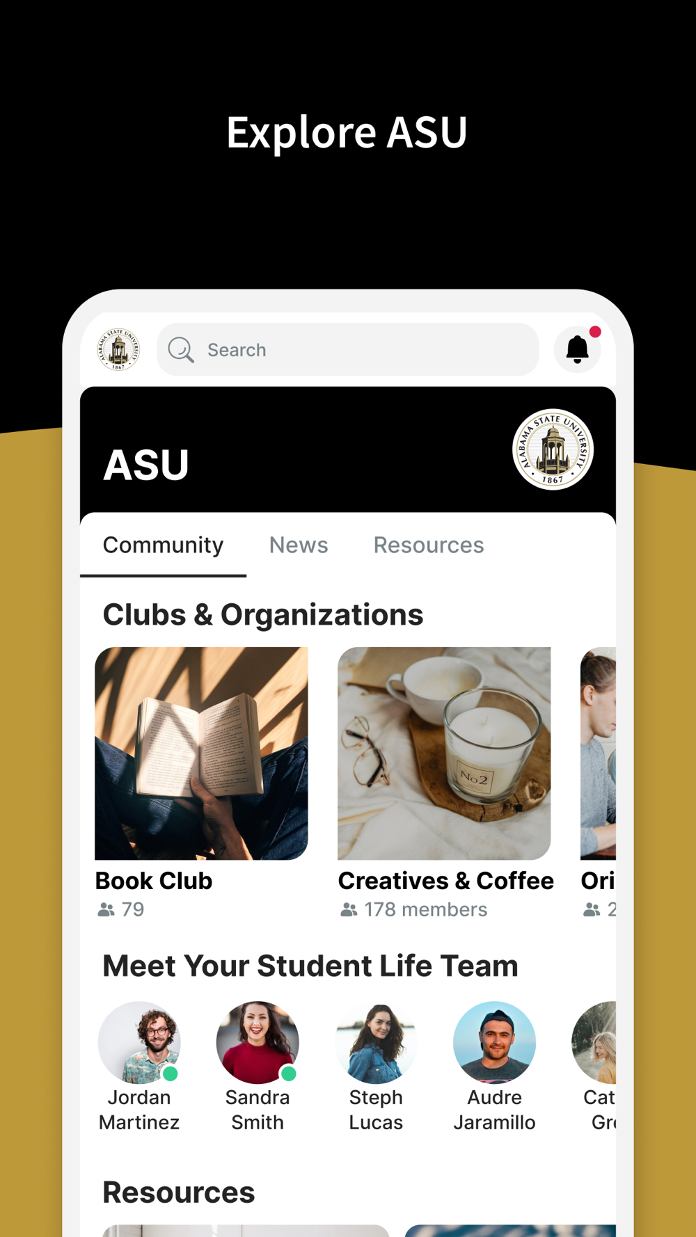 • Discover and explore new communities and meet other students, alumni, or families through messaging, events, polls, and more