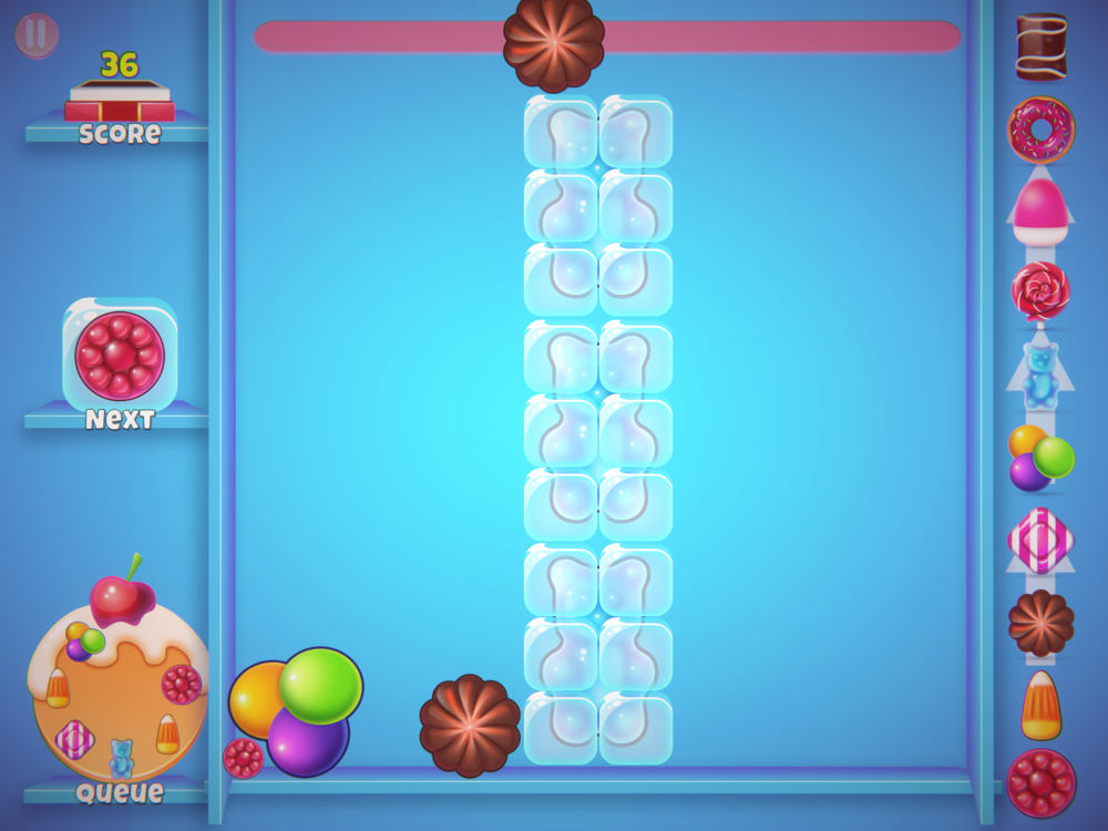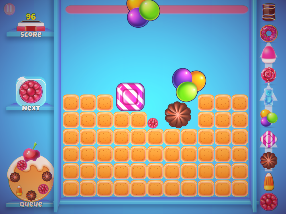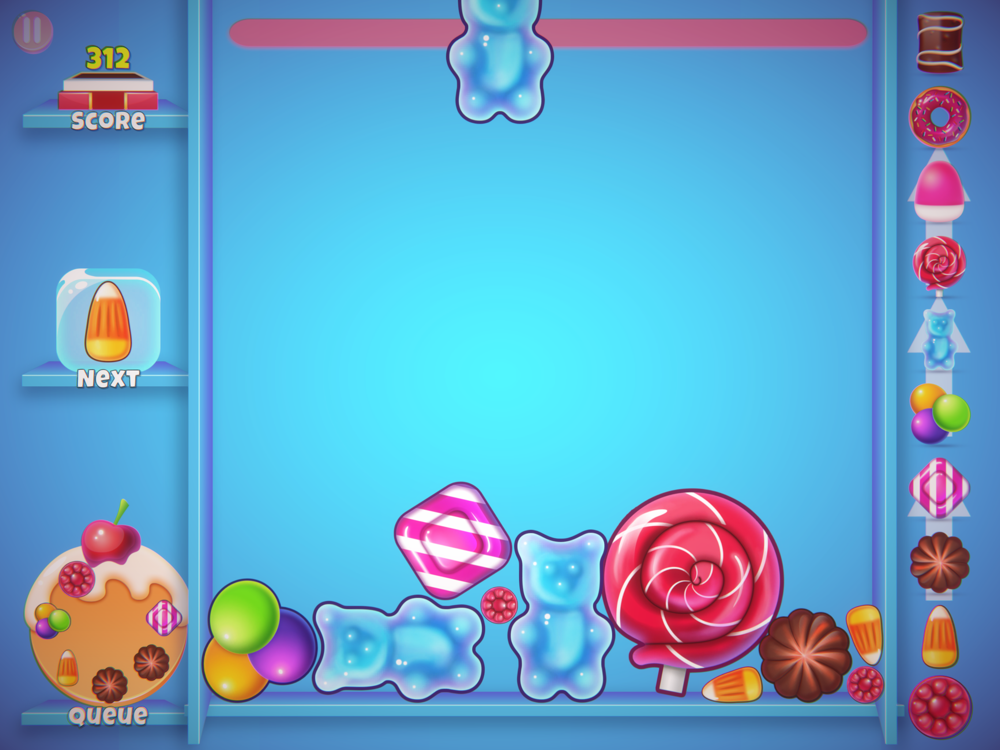 Sweets drop is a casual merge drop puzzle game with three game modes. Arcade mode is an open end game mode where you have to merge as much as possible sweets without touching the red line. The challenge mode gives you 32 challenges to overcome with different shapes of containers or crunchy biscuits to crush or frozen candies to merge. The daily challenge gives you a daily crunchy challenge to overcome.