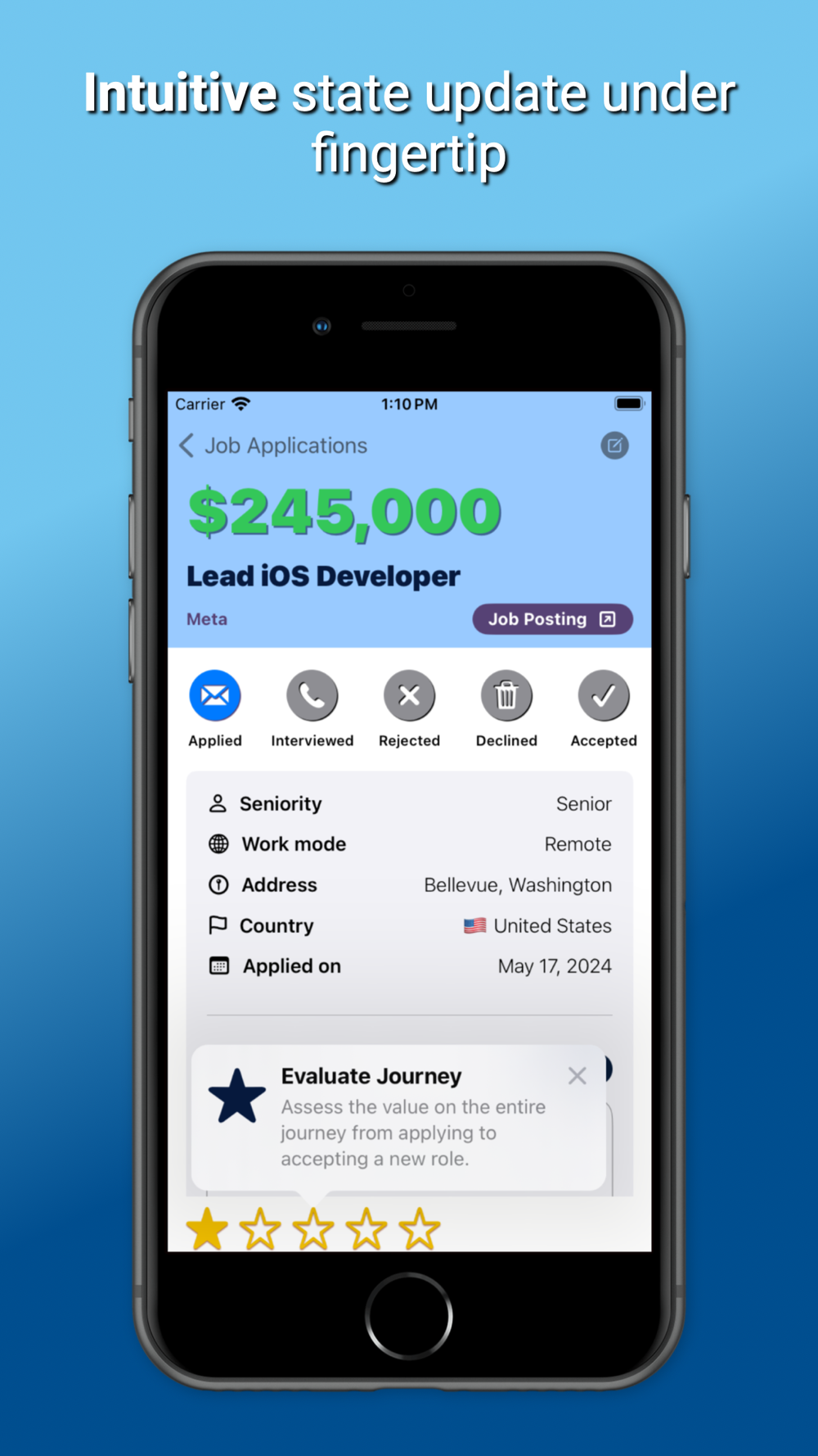 Job search is exhausting and requires much effort to land the dream workplace. We all have been there when we lost ourselves in tens or hundreds of email messages from recruiters either positive or negative feedback about job applications. With the Job Journey, you can abandon the idea of scrolling pages of spreadsheets which is painful on small devices. The Job Journey is flawless it has a list of job applications in one place with an easy-to-use interface. It has colorful marks to help track the current application's status. Need more details? With the Job Journey, it's easy like never before with one tap on the application card, it navigates you to a readable and user-friendly interface where you can edit information or update the job's status. A rating is important for your evaluation. You can rate your entire journey with one tap on the star!