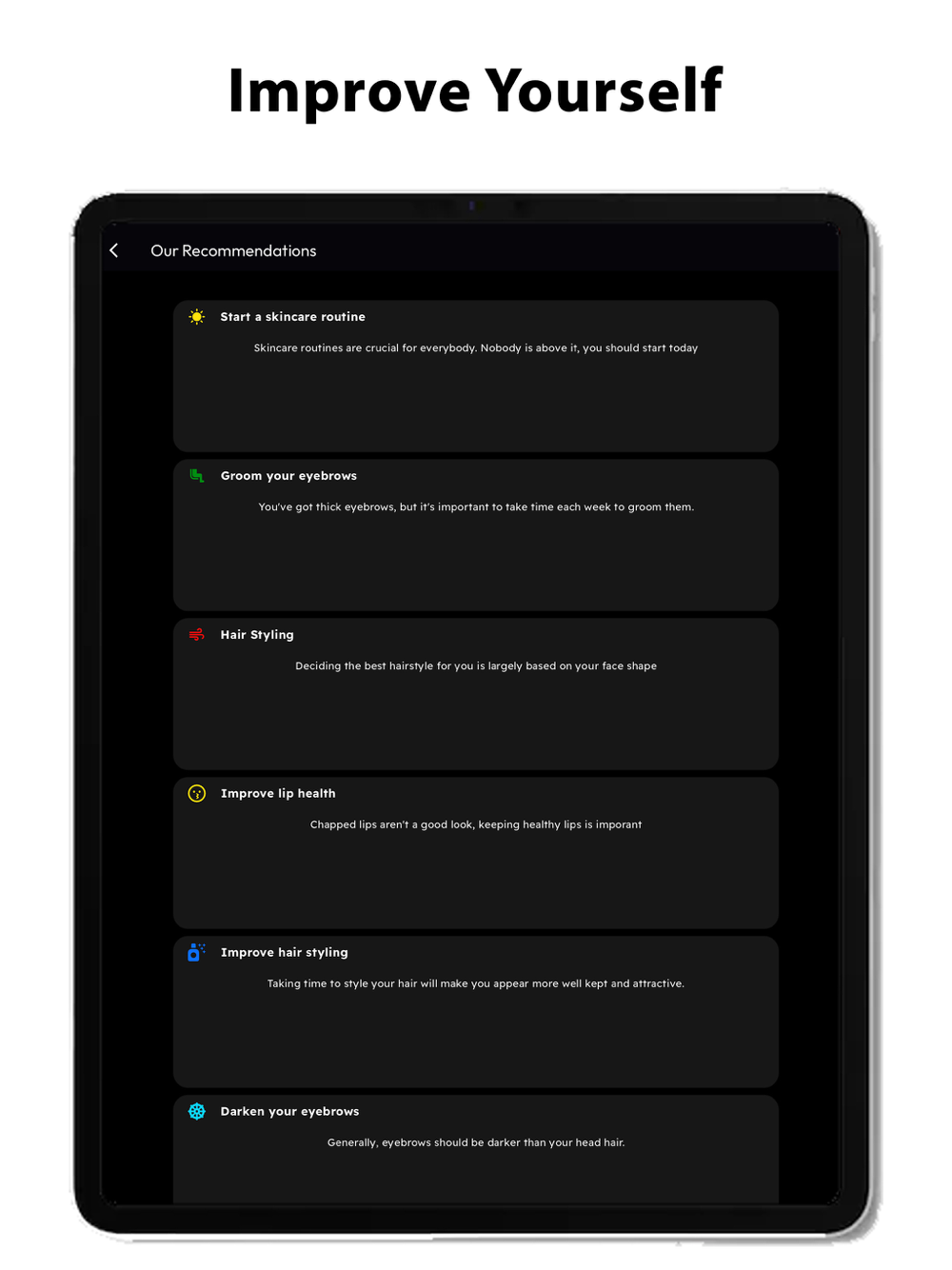 Unlock your unique journey to self-improvement! YouMax offers tailored recommendations to elevate your grooming game. From hairstyle suggestions to skincare routines, discover personalized steps to amplify your best features and address areas for improvement.