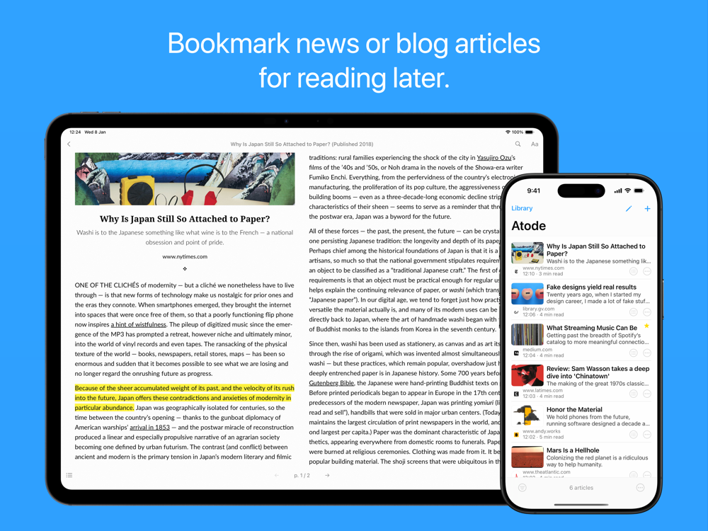 Atode lets you bookmark and save articles for reading later. Save news, blog or other text based content directly from Safari, Firefox, Chrome or any other app. Read anything you saved later in an optimized format with custom styles for better readability and distraction-free reading.