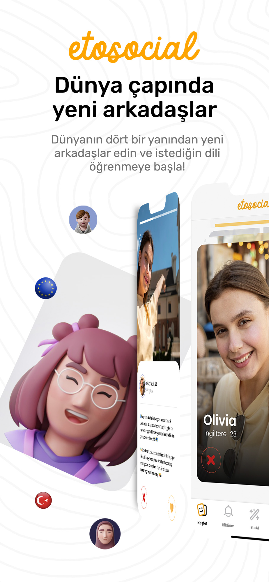 Dünyanın dört bir yanından yeni arkadaşlar edin ve istediğin dili öğrenmeye başla! Dil becerilerini geliştirmek için eşleştiğin arkadaşlarınla hemen konuşmaya başlayabilirsiniz. Seçtiğiniz kategoride, istediğiniz zaman yapay zeka ile konuşabilir ve pratik yapabilirsiniz.