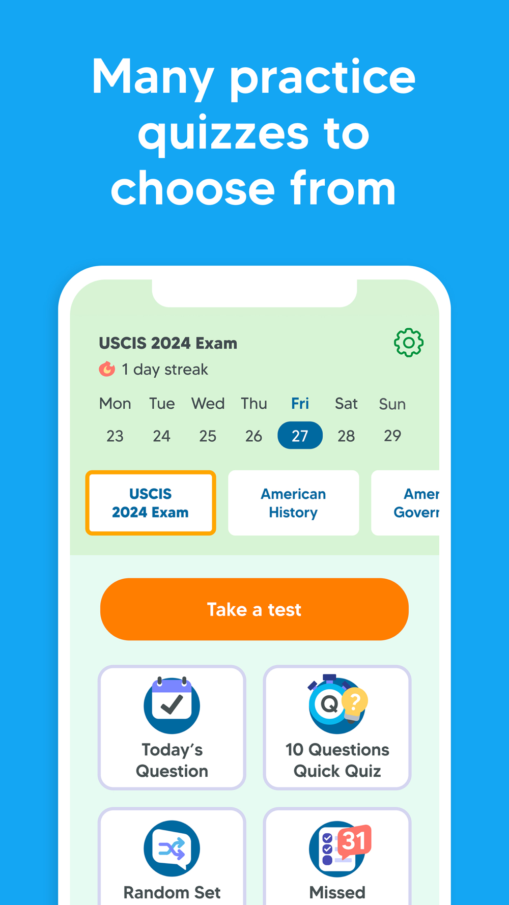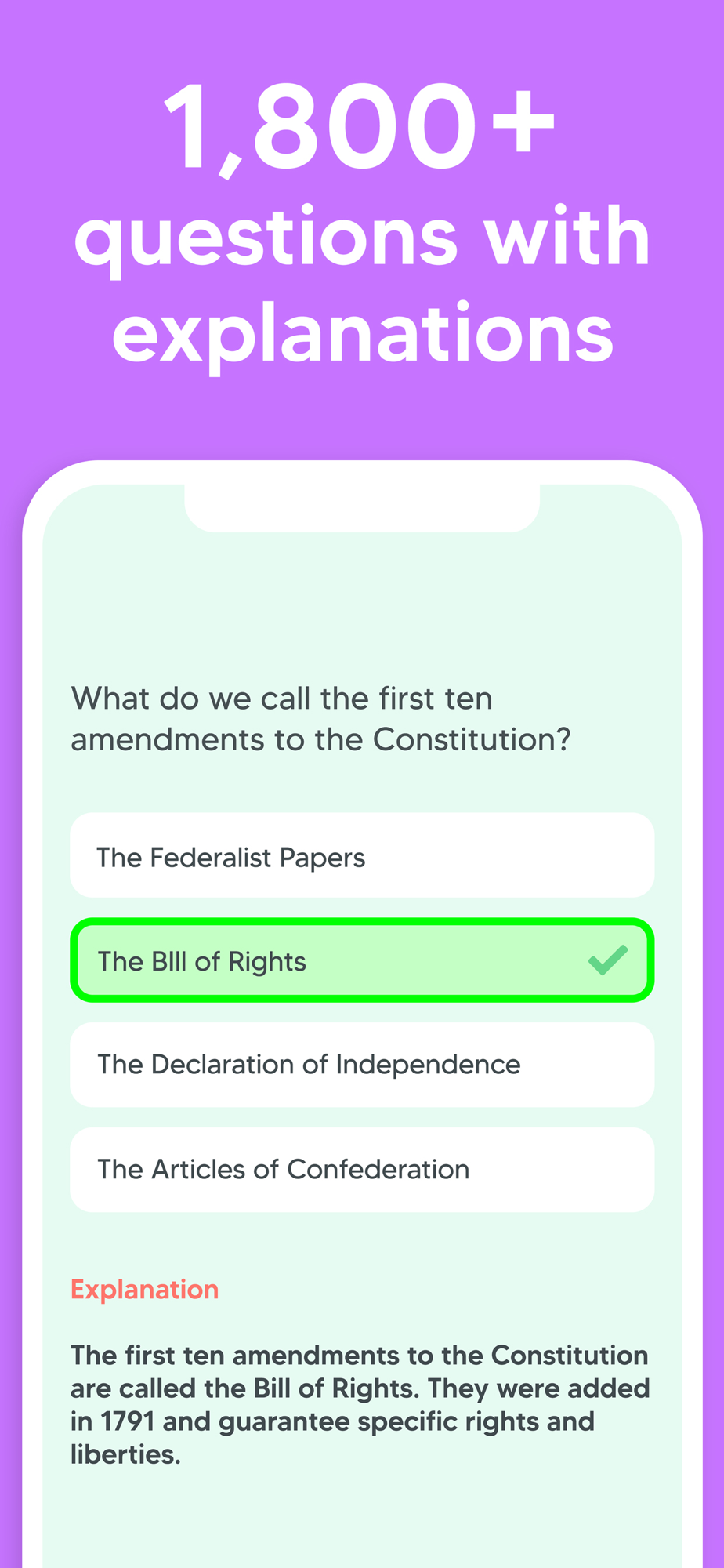 Pass your USCIS Citizenship exam with ease! Take realistic practice exams and quizzes to boost your chances of passing the real exam on your first try. With 1,800+ questions written by experts, detailed explanations for each question, and hundreds of tests & quizzes at your fingertips, this is the only resource you need to prepare for your USCIS Citizenship exam.