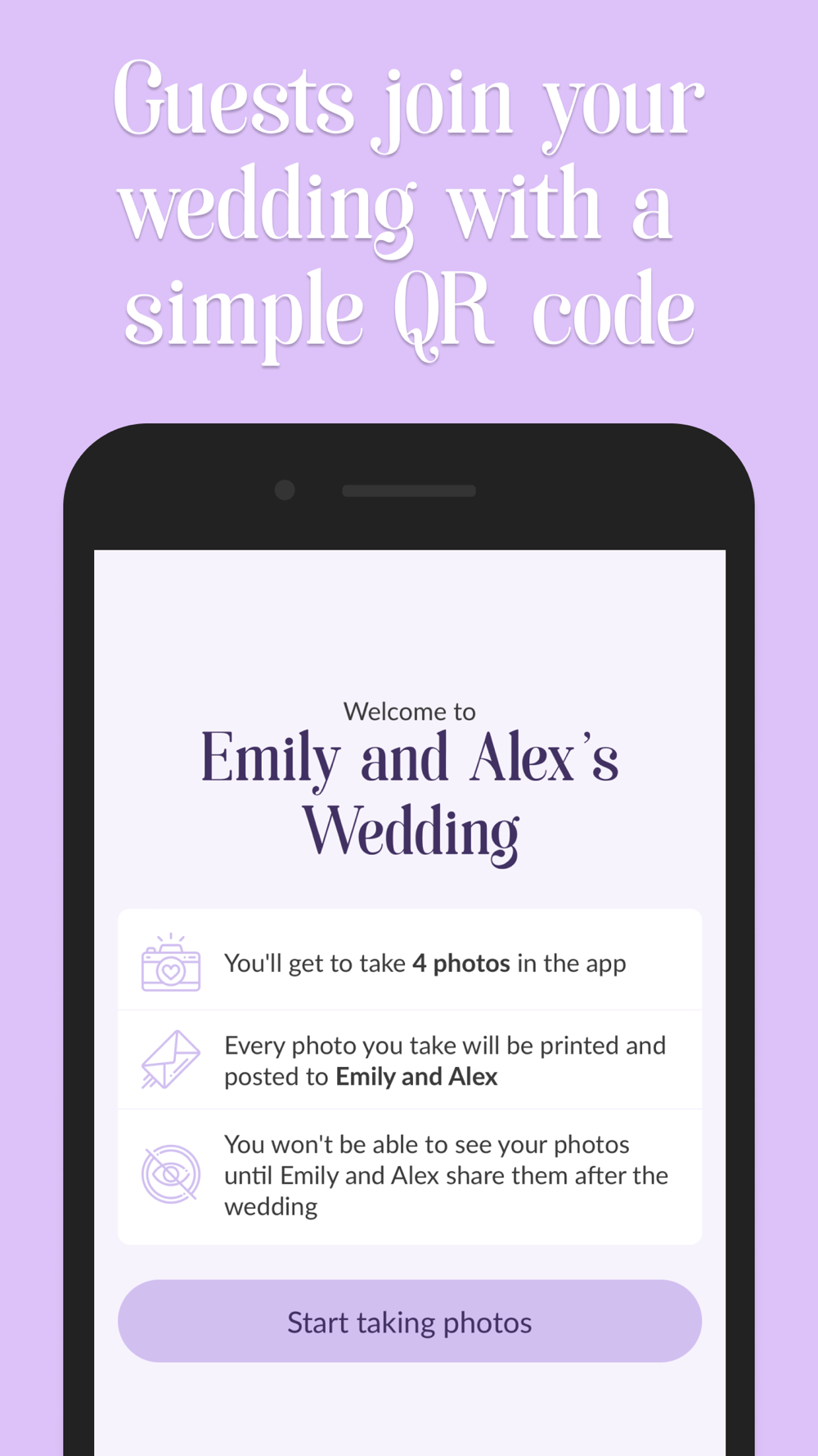 Wedding Snaps is the digital disposable camera for your wedding! Guests can join your wedding using your QR code, and then every photo they take will be printed and posted to you.