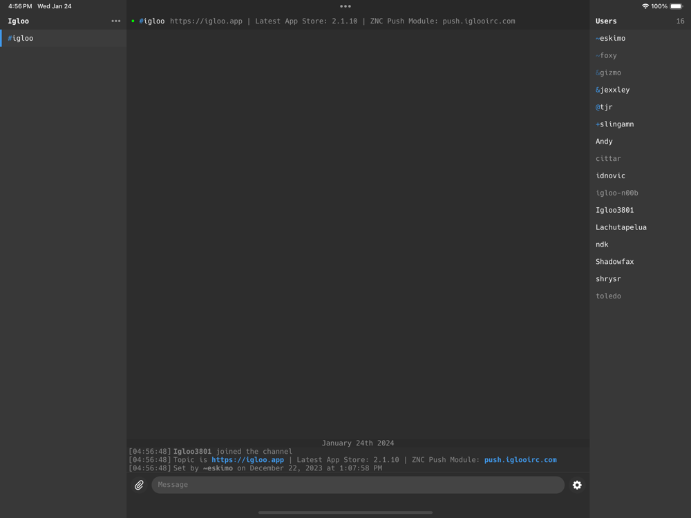 Introducing the new Igloo: a complete overhaul delivering an IRC Client with enhanced performance and stability. This latest version, reengineered from the ground up, offers a refined user experience while maintaining the simplicity and versatility you expect from Igloo.
