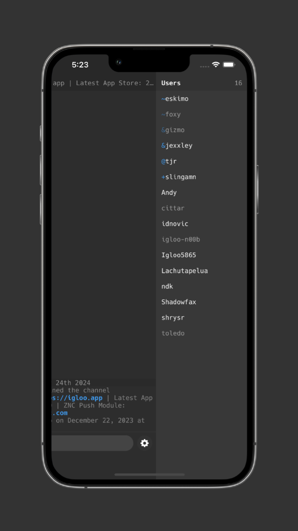 • ZNC Integration: Seamless integration with ZNC and a Push Notification module (https://push.igloo.app).