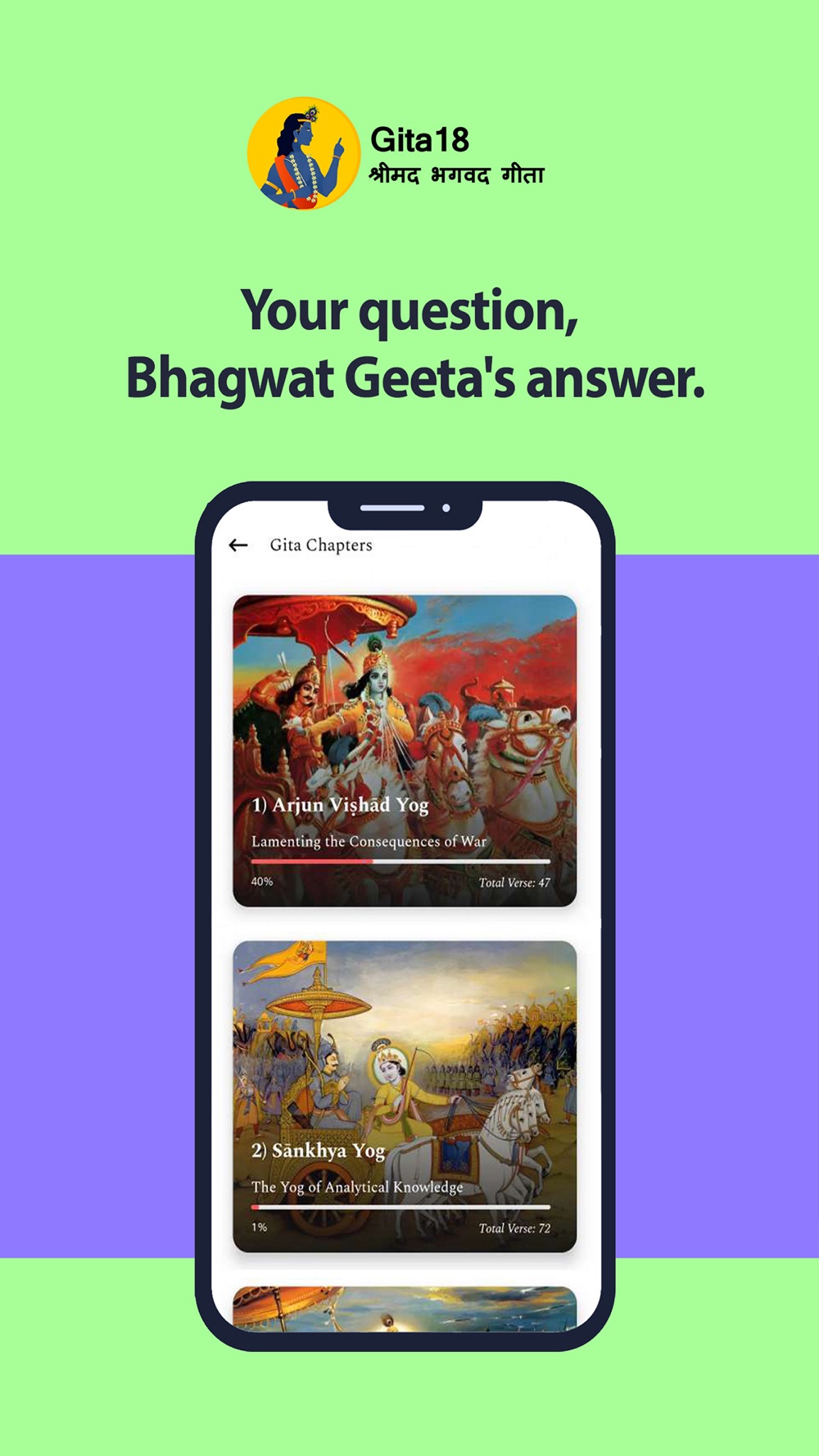 As you discover the teachings of the Gita, you can think deeply about them and how they relate to your life.You can choose which parts of the Gita you want to learn about. If you're interested in things like your responsibilities, being good, or feeling calm inside, our app, Gita18, can help you with that.