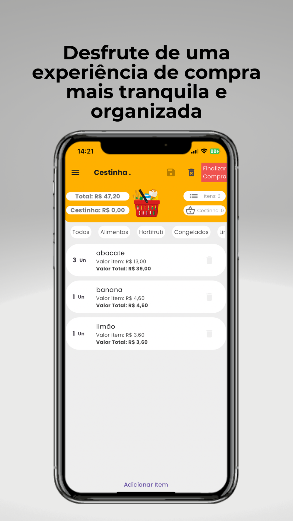 Com o nosso aplicativo, você economizará tempo e evitará esquecimentos, garantindo que suas compras sejam uma tarefa mais fácil e eficaz. Baixe agora e experimente a conveniência de fazer compras com a Cestinha de Mercado!"