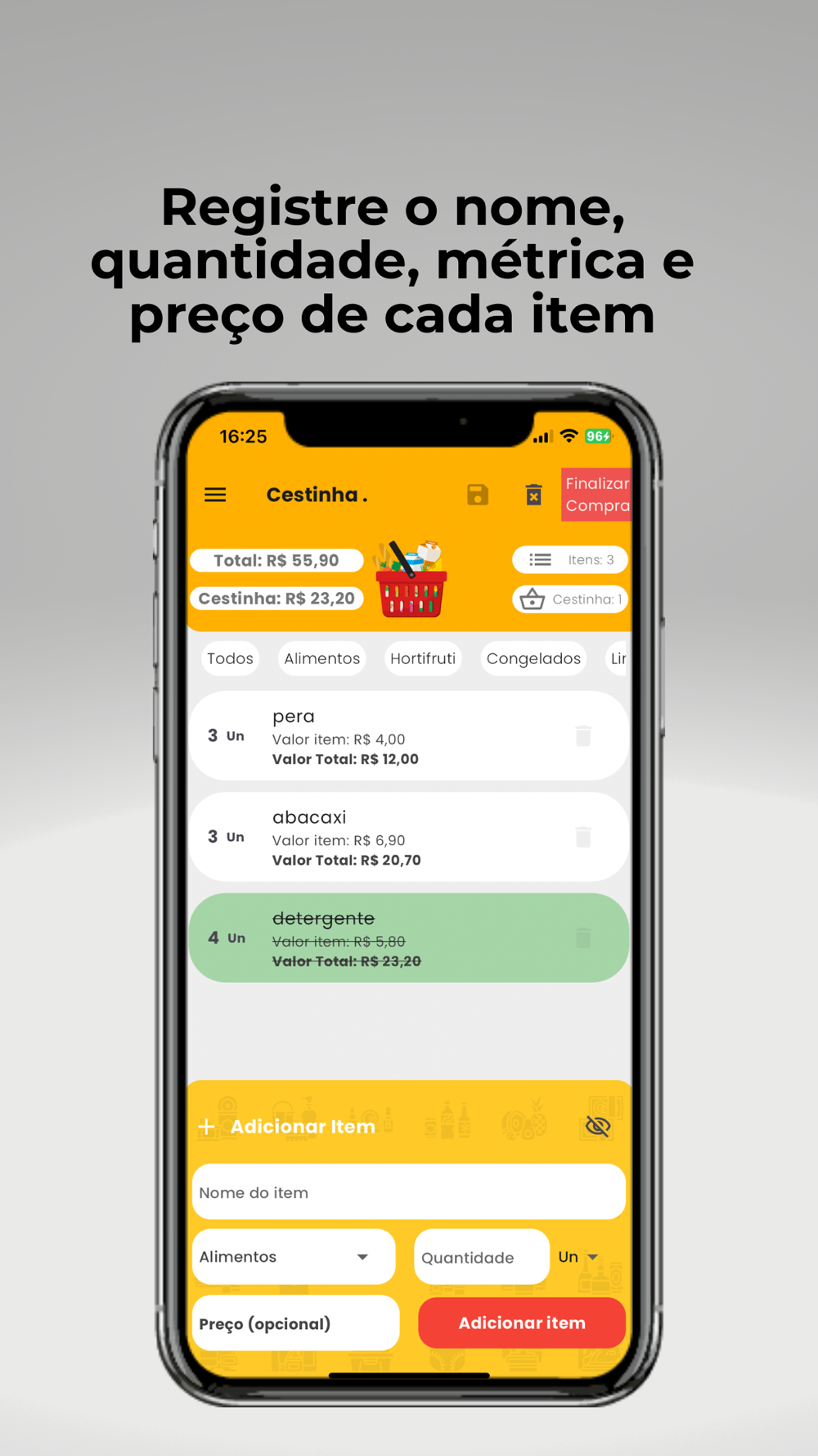 Registre o nome, quantidade, métrica e preço de cada item.