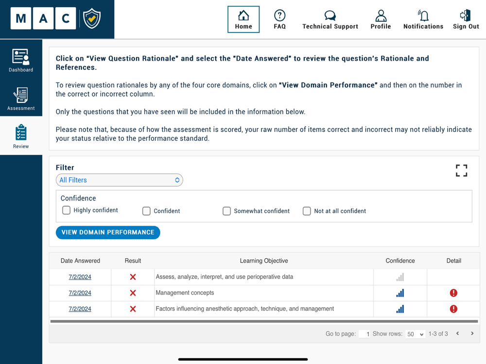 MAC Check is a self-paced, online platform that uses a longitudinal assessment approach. CRNAs currently enrolled in the Maintaining Anesthesia Care (MAC) program can complete their quarterly MAC Check questions in the MAC Check mobile app. The app also tracks a CRNA’s progress and performance, allows CRNAs to review rationale and marked questions, and elect time off quarters.