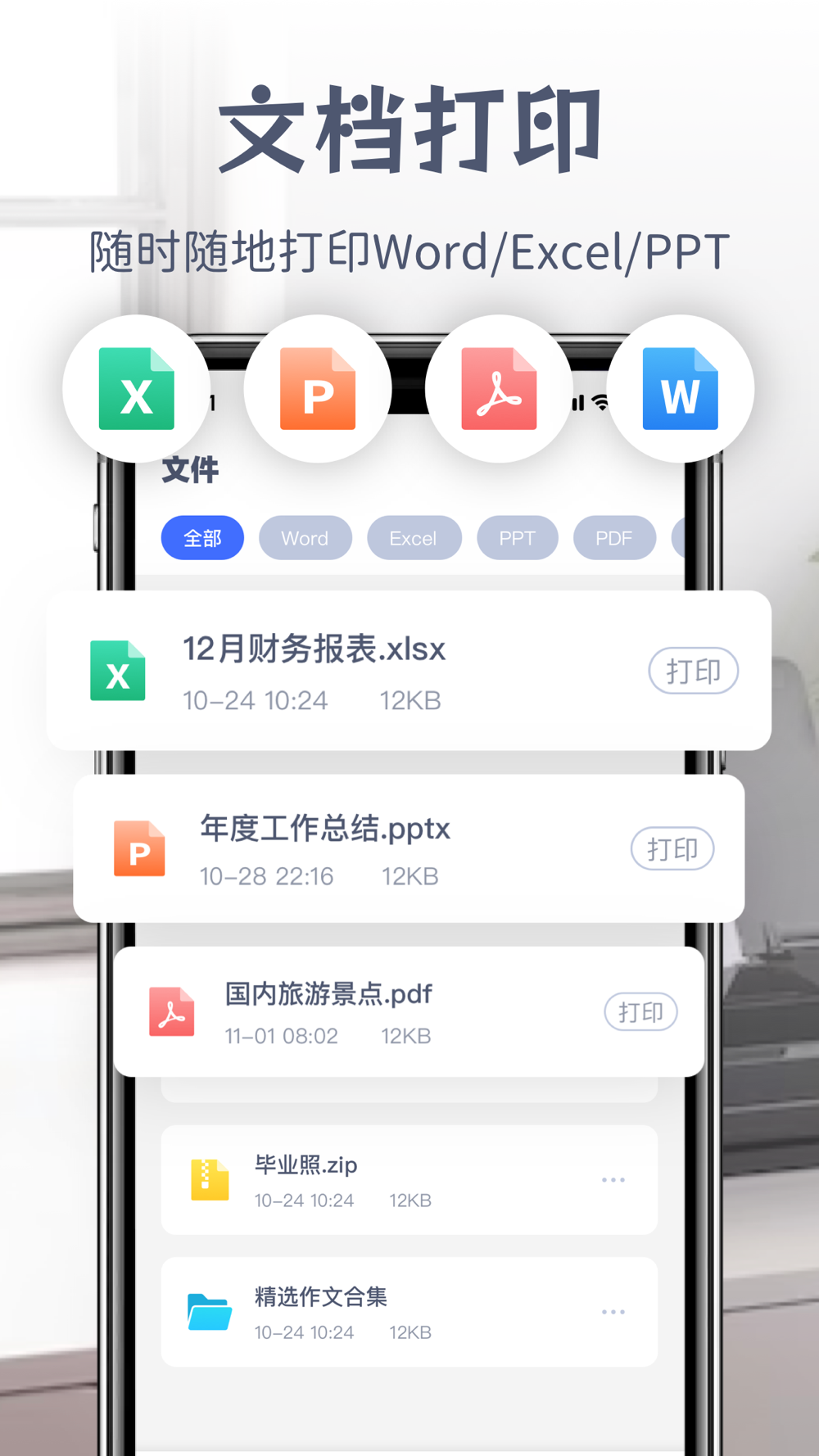 文档打印:可以打印word/excel/ppt/pdf四种常用文件类型;