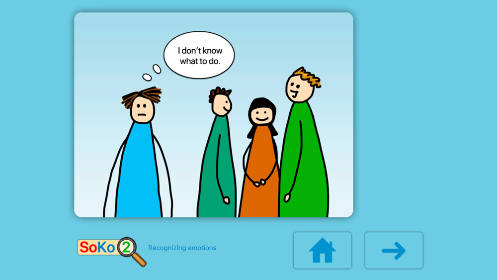 We recommend that autistic individuals training with our Foni SoKo2 App should be supported by a professional therapist or teacher, a coach, or a parent or guardian. For each situation, users can choose between two possible answers. After making a choice, they are asked a follow-up question: “Why did you select that option?” The question encourages them to reflect on their choices and to get into a conversation about them. Such a dialogue can also help to address possible misunderstandings, which may have arisen with regard to the meaning of a cartoon.