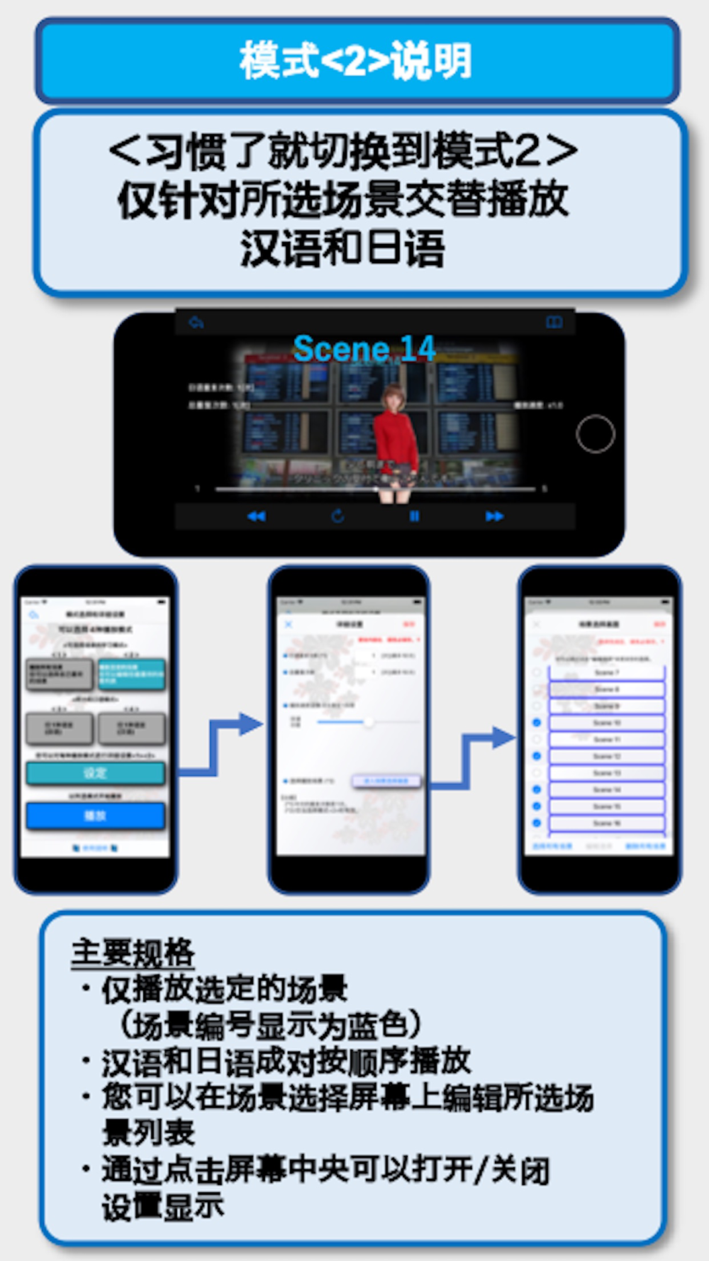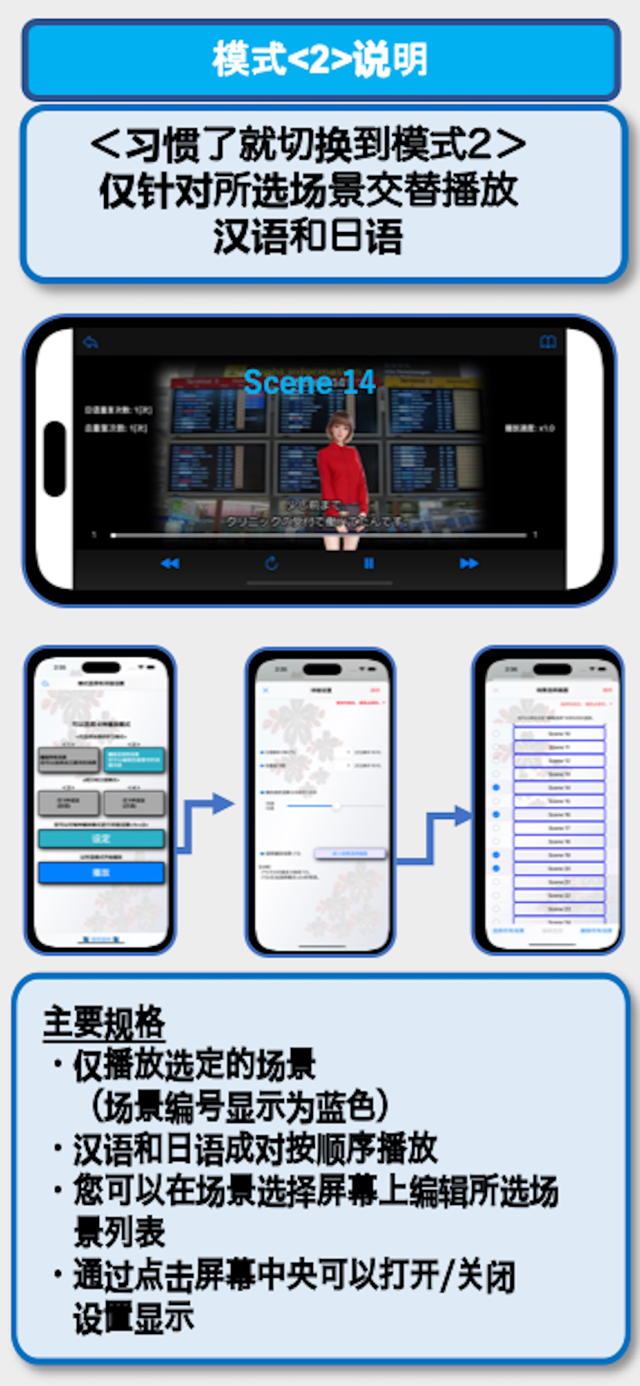 在这个应用中,基于完全记忆的前提,您可以按照以下示例的方式,进行汉语到日语的双方对话,依次推进观看。