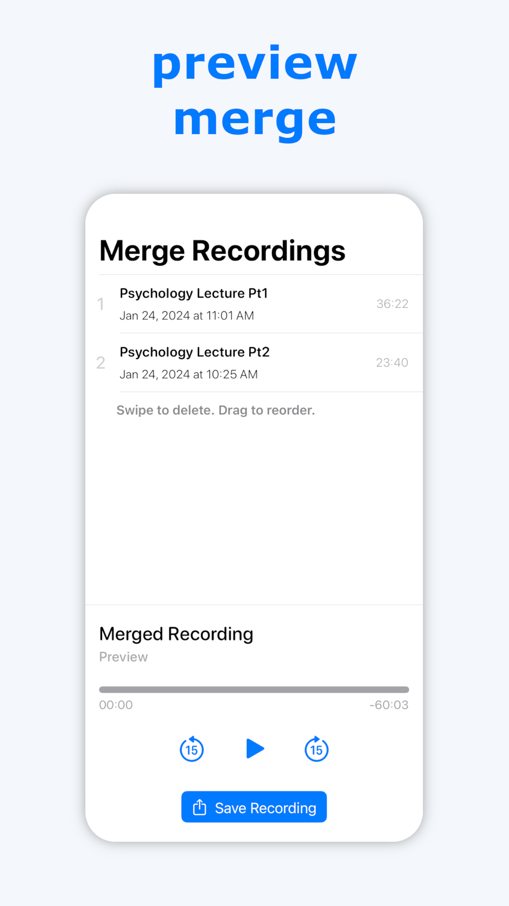 The simplest way to merge voice memos is with the Merge Voice Memos app.