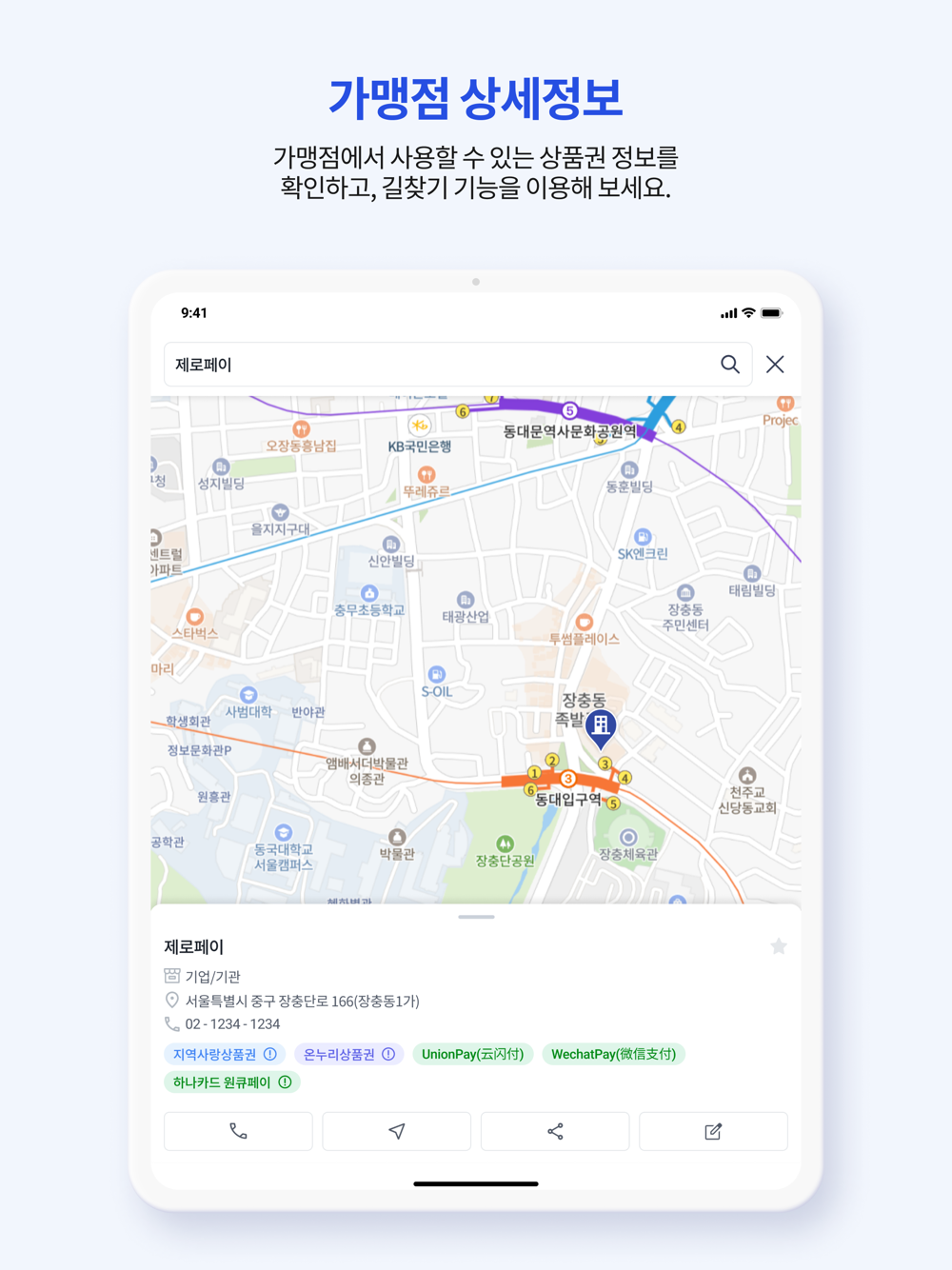 - 가맹점에서 사용할 수 있는 상품권 정보를 확인하고, 길찾기 기능을 이용해보세요.