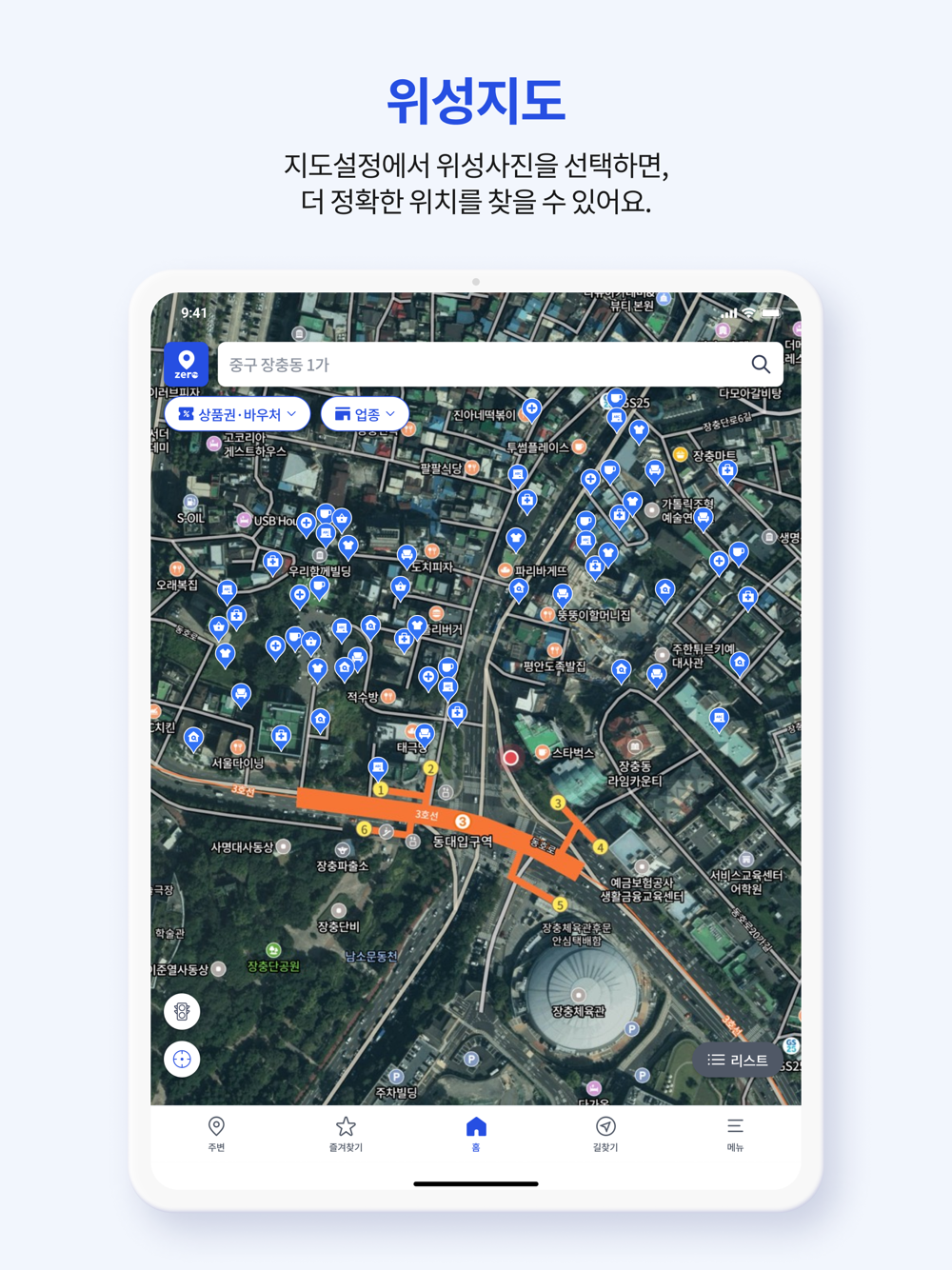 - 기본 지도, 위성지도 등 다양한 지도 화면을 제공하며, 교통정보도 확인 할 수 있어요