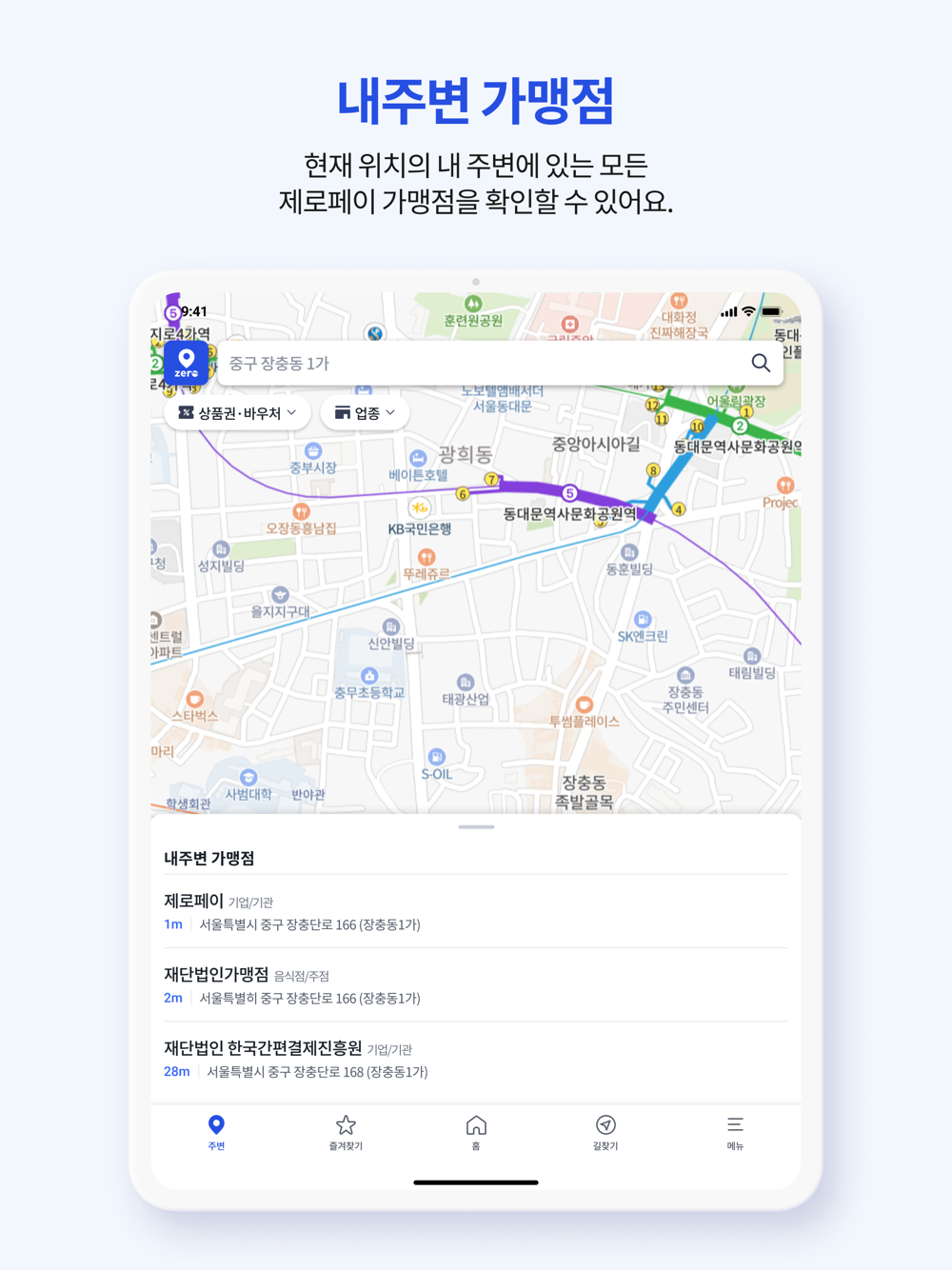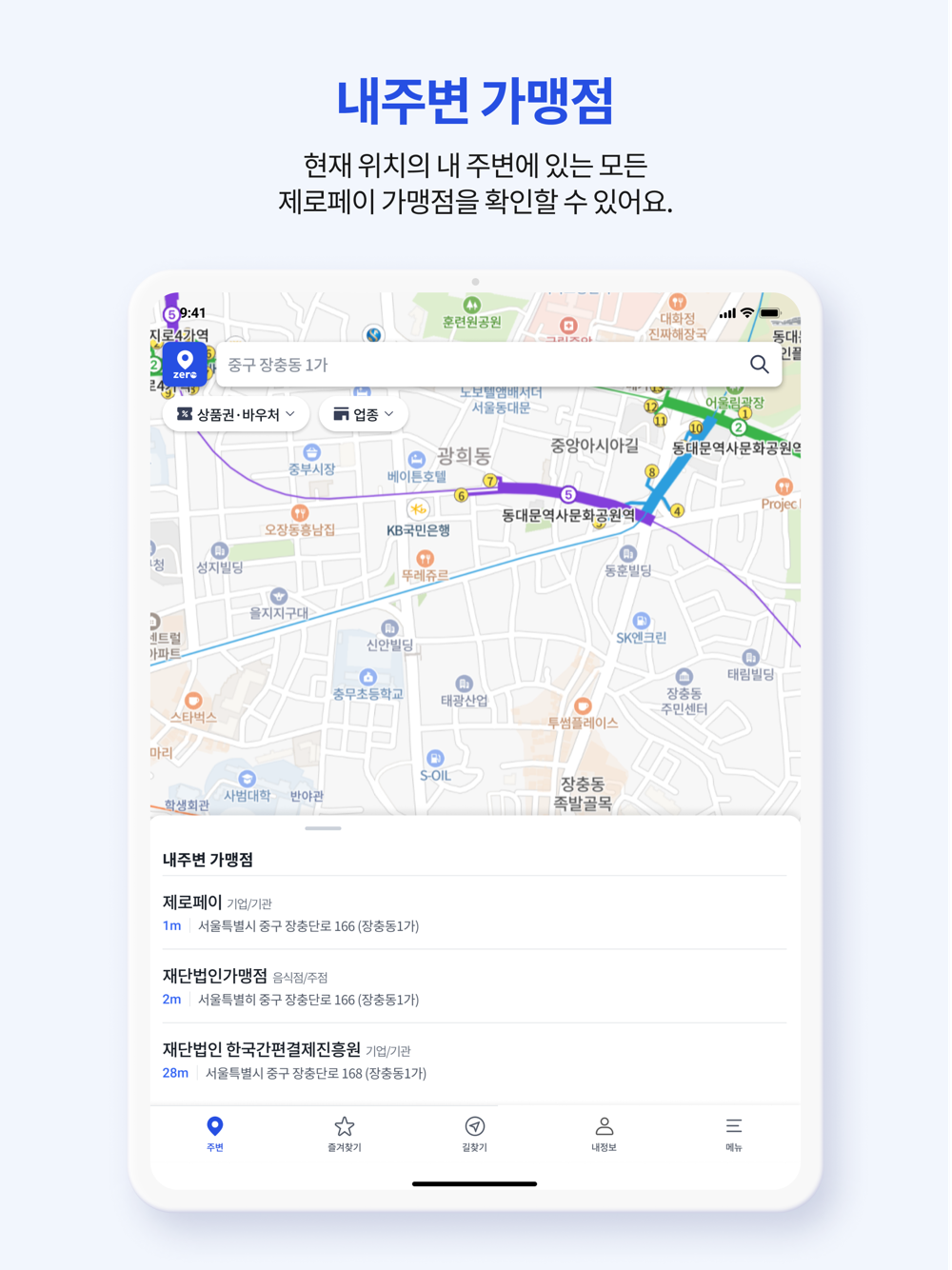 - 현재 위치의 내 주변에 있는 모든 제로페이 가맹점을 확인할 수 있어요.