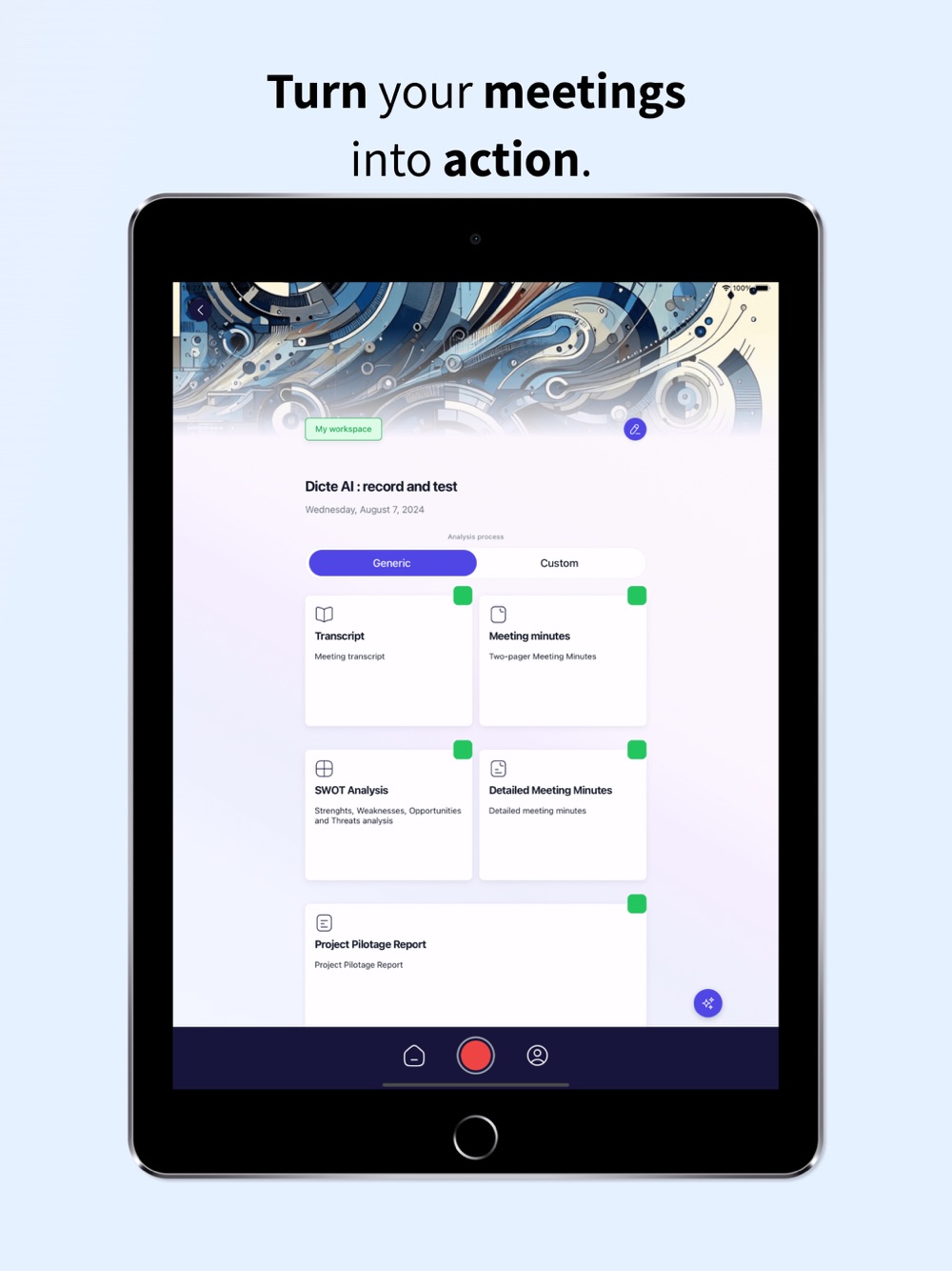 ディクテで会議を最適化しましょう。この倫理的なAIアシスタントが、会話を文字起こし、分析、要約し、すぐに使える専門的な文書を生成します。毎週数時間を節約し、チームの可能性を最大限に引き出せます。