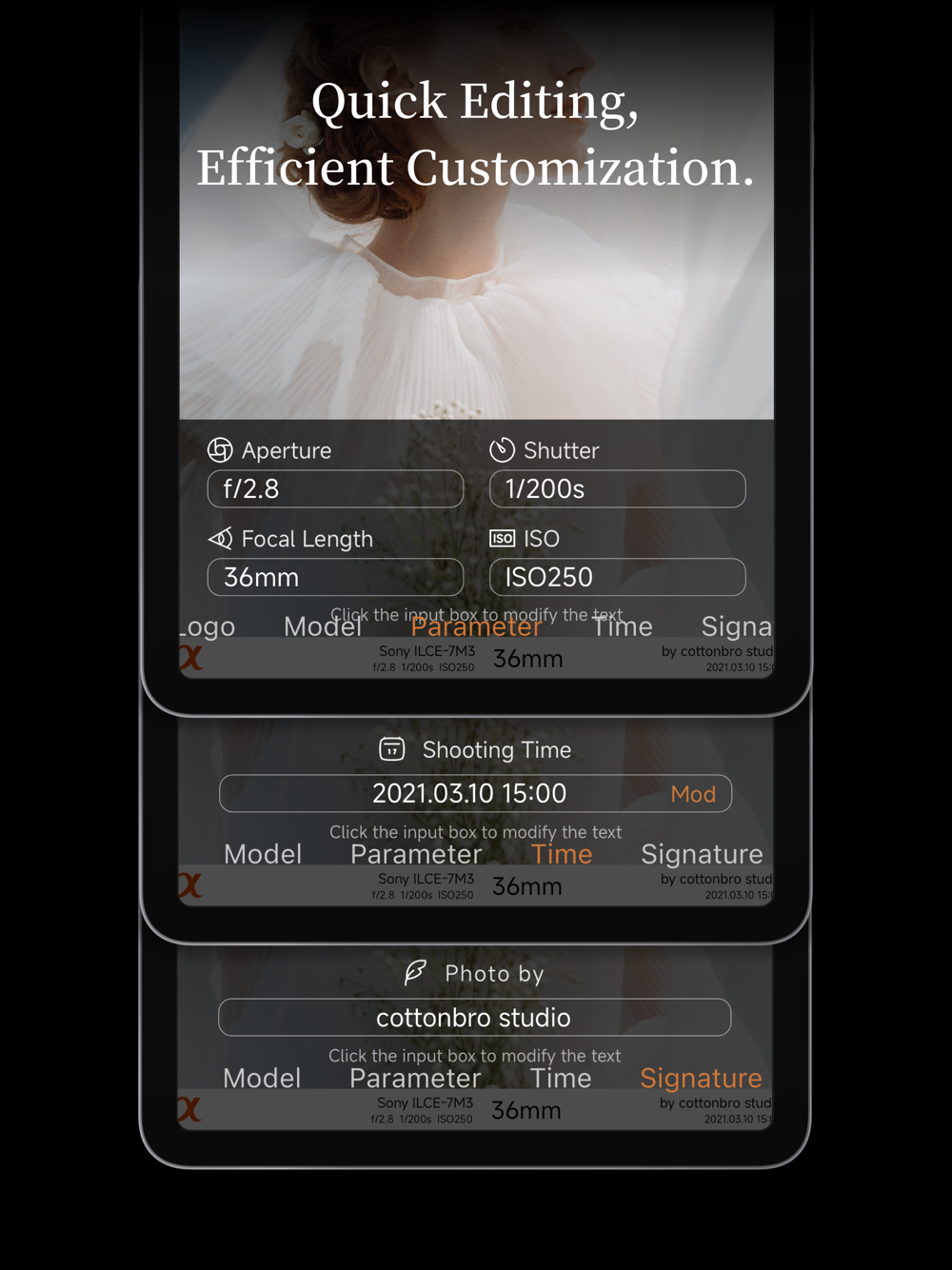 Mendukung berbagai format gambar termasuk JPEG, PGN, BMP, WEBP, DNG, NEF, RAF, CR3, dll. Mentransfer foto yang diambil dengan kamera digital ke ponsel Anda, dan selama foto tersebut dapat dibaca di Foto iPhone, kami dapat membacanya secara akurat. Informasi Exif tidak lengkap? Tidak masalah, dari logo hingga teks, semuanya dapat disesuaikan.