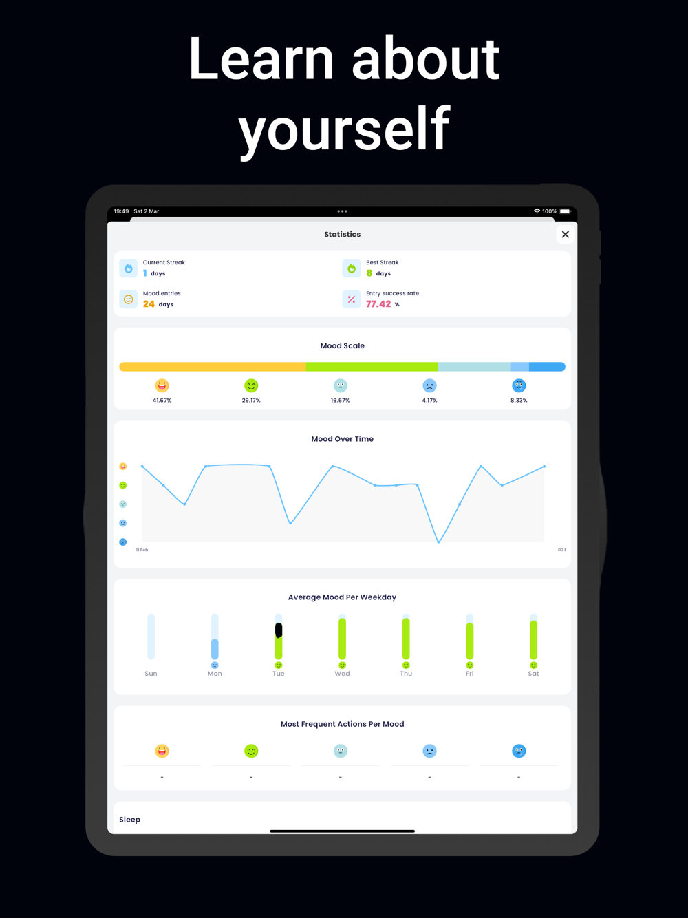 Sophisticated Mood Tracking: Blissful’s nuanced mood tracking system lets you capture the essence of your emotions. Chart your feelings with ease and gain valuable insights into your emotional patterns.