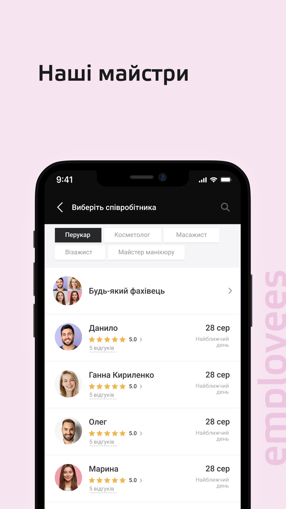В додатку Ви можете записатися на будь-яку послугу, ознайомитись з графіком роботи та вартістю послуг.
