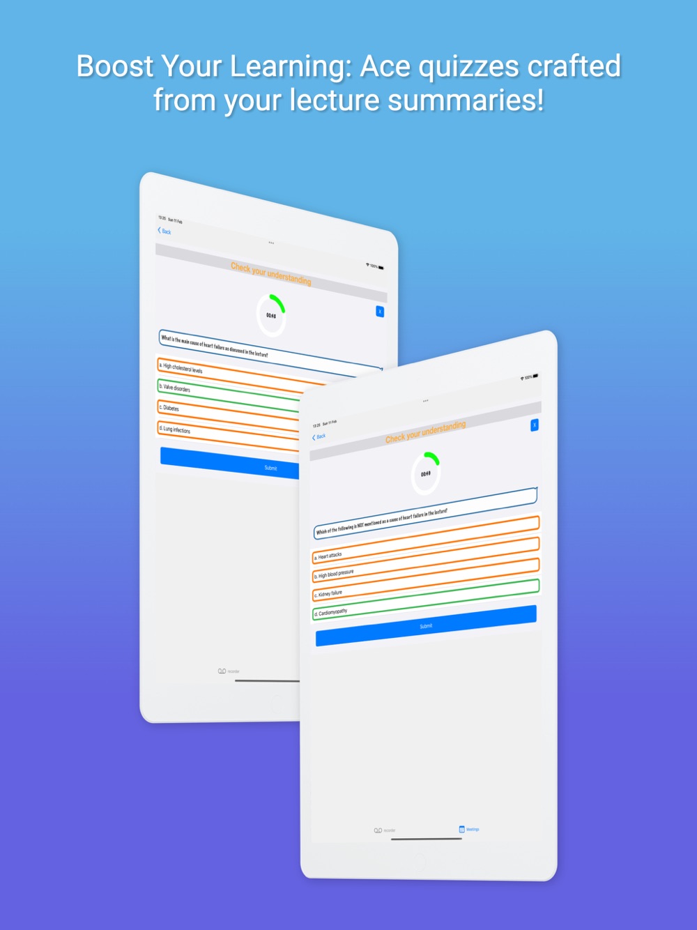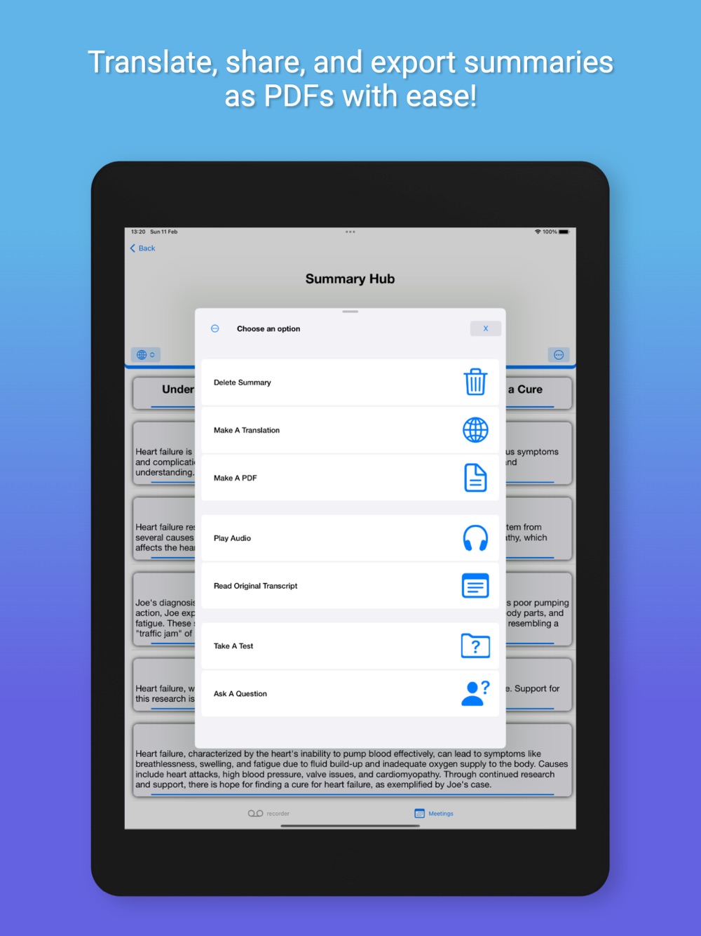 Unique Academic Tests: Engage with bespoke tests created from summaries for academic meetings and lectures to deepen understanding and retention.
