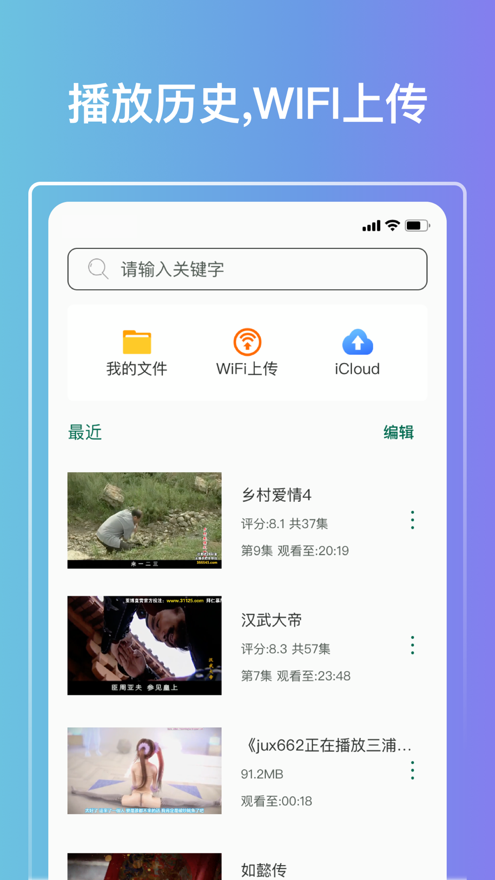 - 简洁的播放管理,记录上次观看时间,播放集数,以及视频截图,并组织和播放各种类型各种来源的视频,无需手动添加,系统自动帮您整理