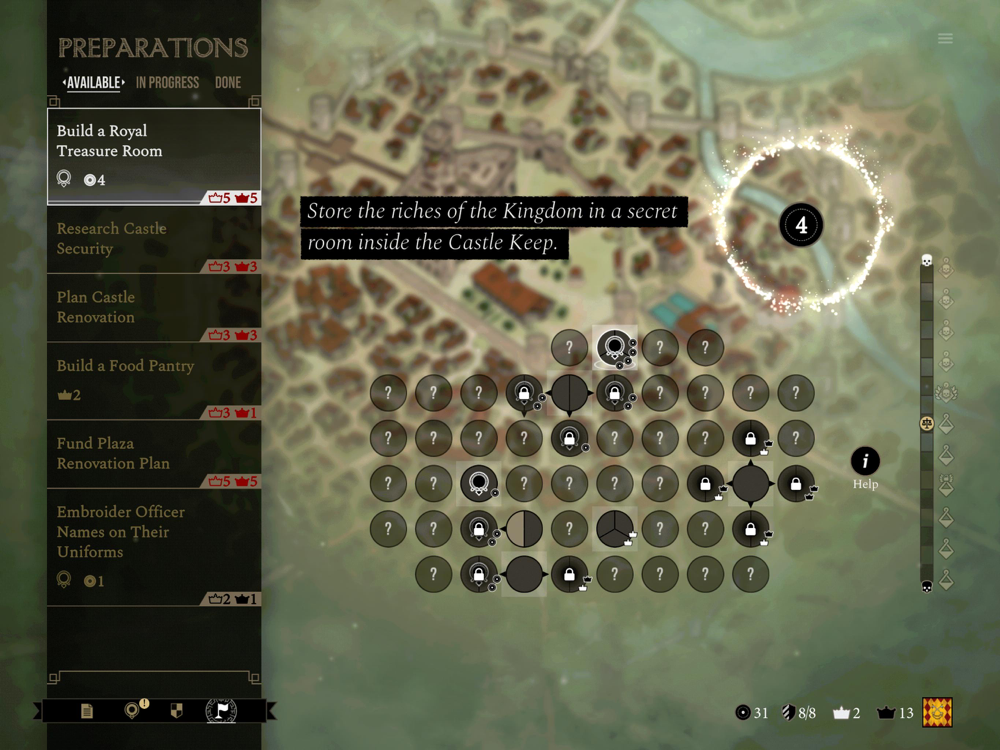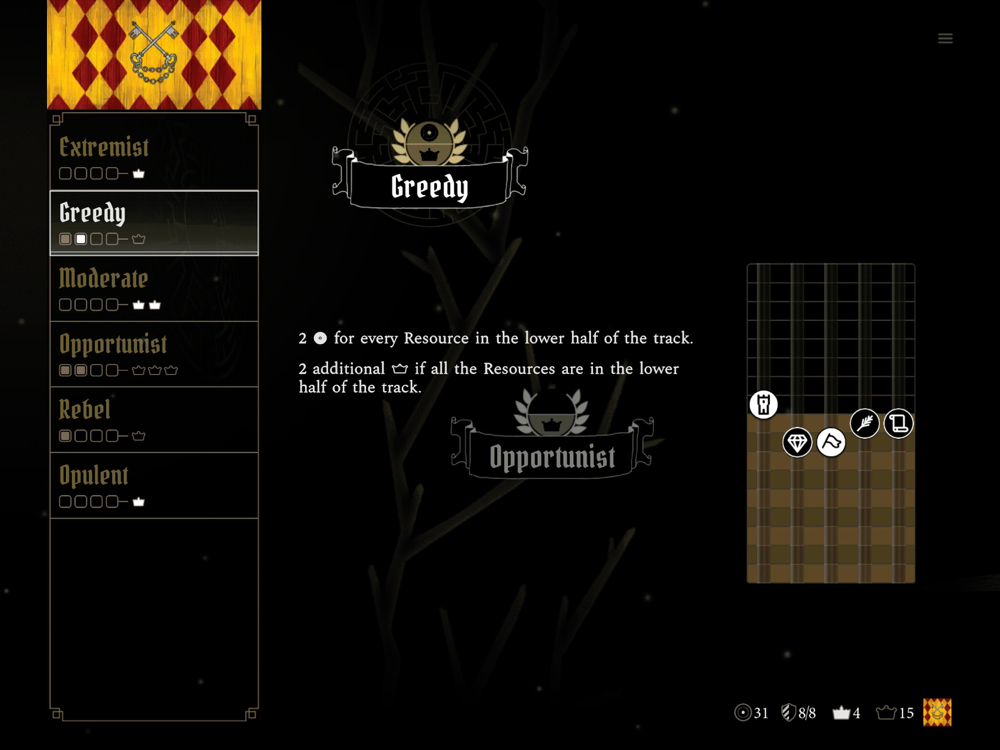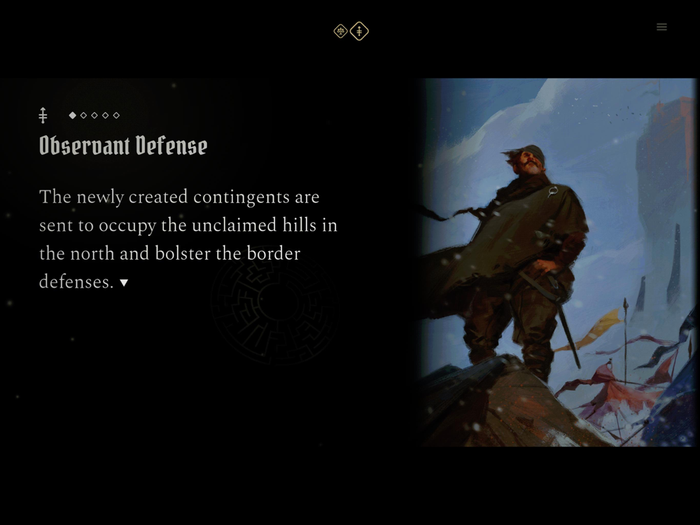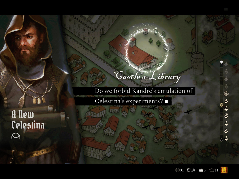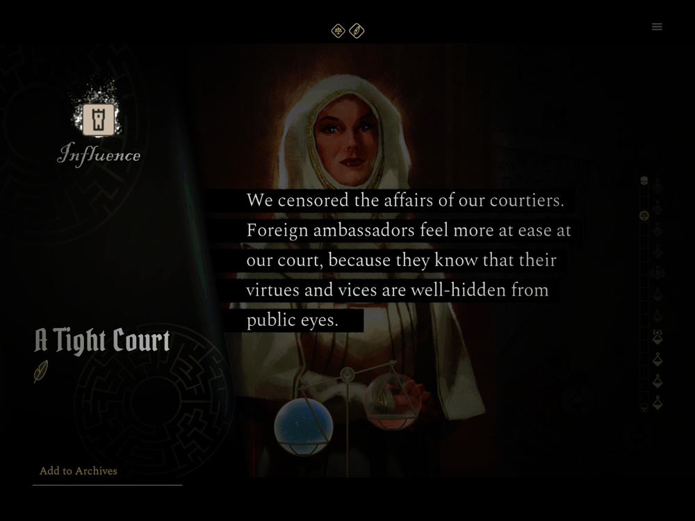 "Jede Entscheidung, die du triffst, hat Auswirkungen auf deine Beziehungen zu den anderen Häusern und auf die Ressourcen des Königreichs, was wiederum dazu führen kann, dass der König abdankt oder gestürzt wird. Doch sie lassen auch mehr Dilemmas auf der Karte verfügbar werden. Abhängig von den Ressourcen, die am Ende der Herrschaft des aktuellen Königs vorhanden sind, und deiner moralischen Ausrichtung erhältst du ""Gier-"" und ""Einfluss-Punkte"", die du für die Erforschung von Technologien, Expeditionen, oder den Bau von Gebäuden ausgeben kannst. Welche dieser Möglichkeiten zur Verfügung stehen, hängt von deinen Entscheidungen ab.