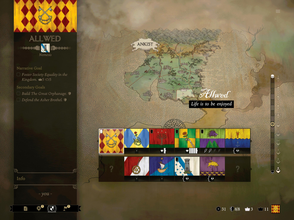 Erkunde die Karte von Ankist und sieh dir die aktuellen Probleme des Königreichs an. Wähle eines aus und der Rat wird einberufen, um eine Entscheidung zu treffen: Sollen wir den von der Hungersnot betroffenen Menschen Hilfe schicken? Sollen wir Krieg gegen den nördlichen Stamm führen, der die Dörfer jenseits unserer Grenze überfällt? Die Häuser werden ihre Stimme abgeben: "Ja" oder "Nein", je nach persönlichem Interesse und politischer Einstellung. Zu diesem Zeitpunkt kannst du die Abstimmung beeinflussen, indem du die Finanzen deines Hauses ausgibst, um die Mitglieder des Rates zu bestechen, oder indem du einige der begrenzten "Macht"-Punkte verbrauchst, die du für die Herrschaft jedes Königs erhältst.