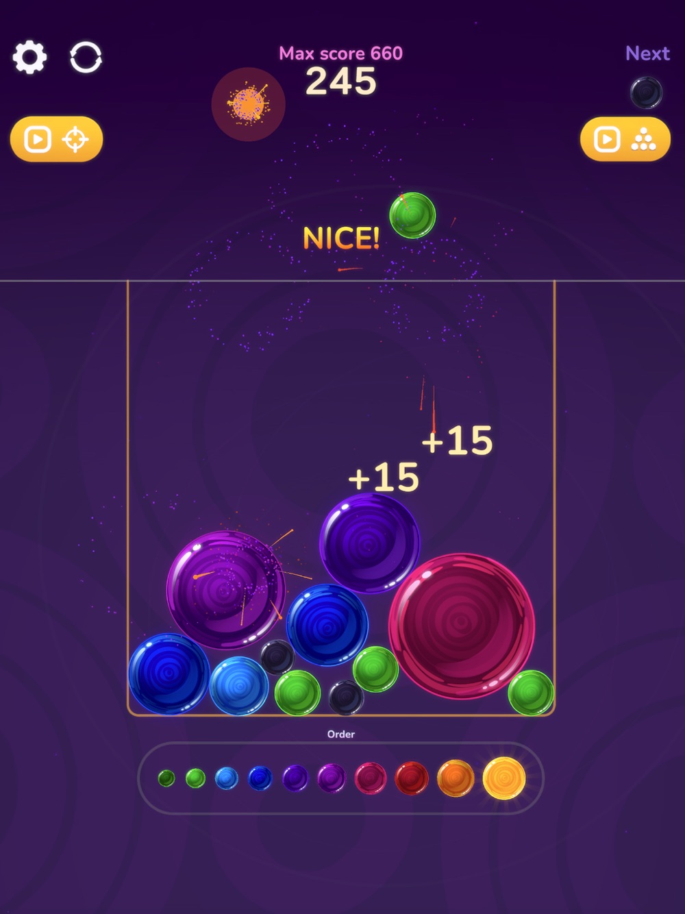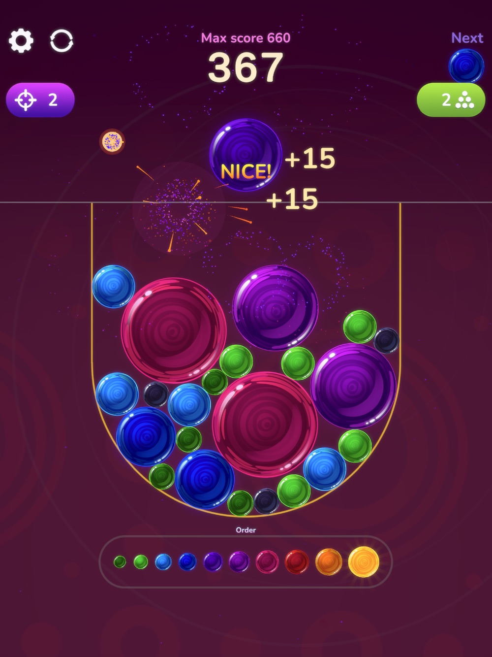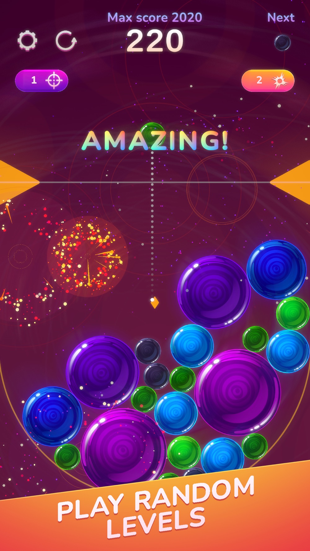 Merge balls of the same color to get the next ball. And achieve the final form - a sun ball!