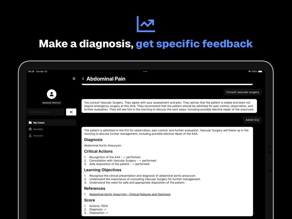 Introducing u-sim, the first AI-based app for medical simulation. Simply enter a complaint or topic, and u-sim builds a dynamic simulation scenario.