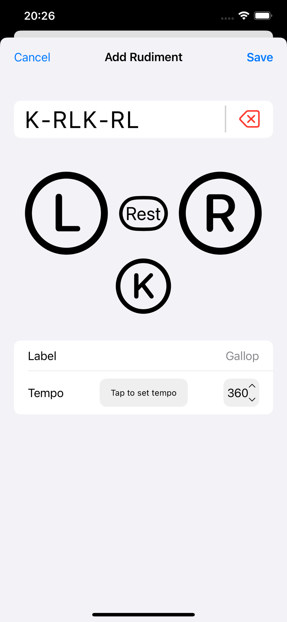 'Fills & Rolls' is the more drumming-oriented section of MyDrumClick. Here, drummers can keep a list of all the rudiments, rolls and fills they want to learn or have already learned but want to get better at. Each rudiment consists of a sequence of strokes and rests. Strokes can be either hand strokes or foot strokes. You can even choose whether your hand strokes are accented notes, ghost notes or ordinary notes. MyDrumClick also allows you to attach a tempo to each rudiment in case you want to keep track of the highest speed you've managed to play it consistently. Or maybe that tempo represents the golden bpm around which that rudiment should be played to sound good. It's up to you!