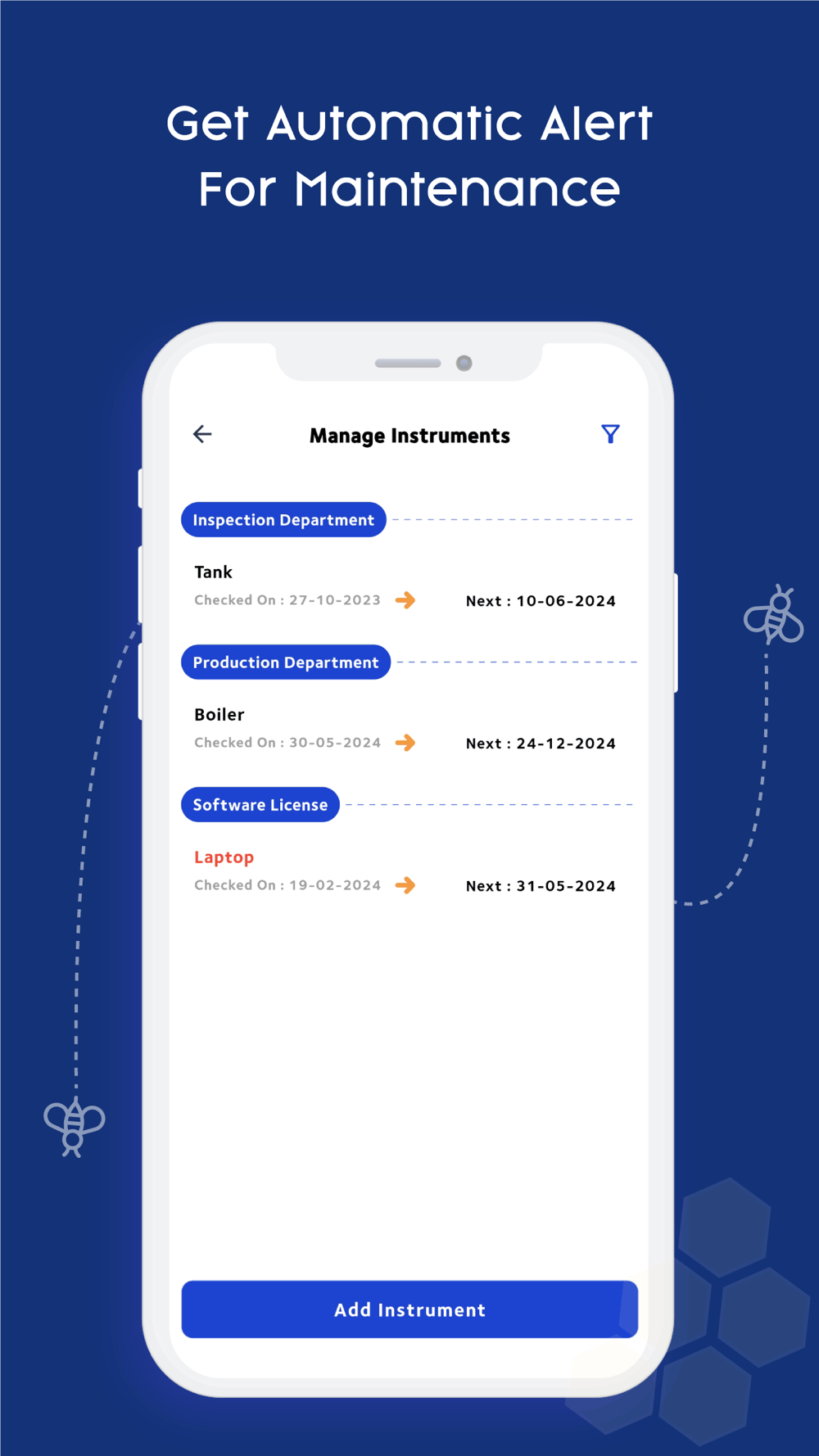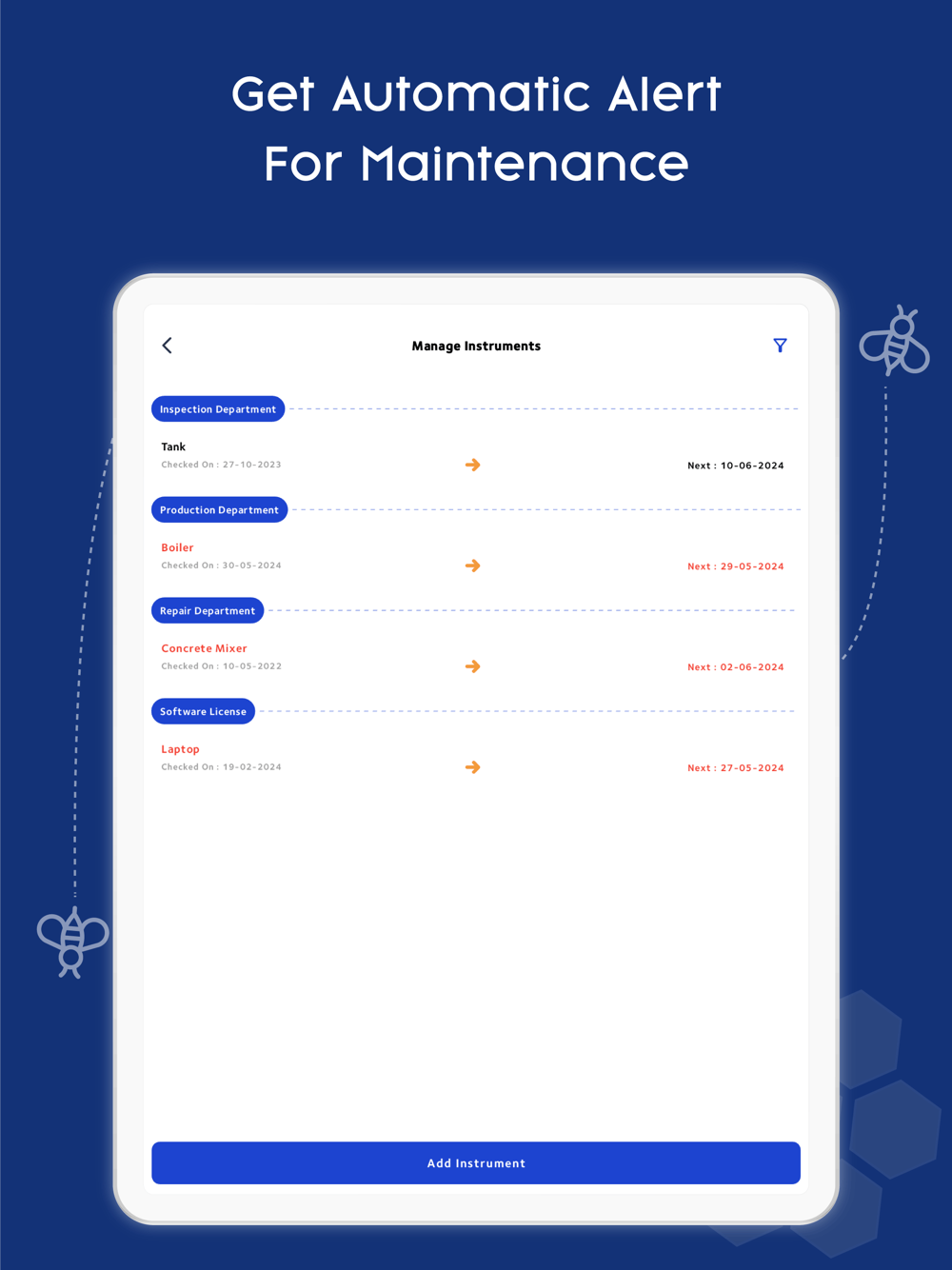 WorkingBee automatically notifies users about upcoming instrument calibration dates two days in advance, ensuring timely renewals and uninterrupted operations.