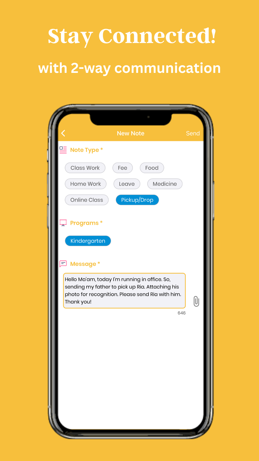 Parent-Teacher communication: You can send any requests or queries to the teacher through the app and can attach photos, voice messages or documents if needed. For example, if you are running late in the office and need to send someone else to pick up your kid, now you don’t have to worry about the visitor’s ID card. You can send the information to the teacher directly in the app and attach their photo. You’ll be notified as soon as the teacher replies.