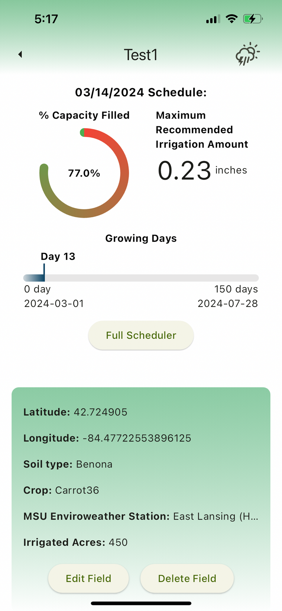The Irrigation Scheduler App is designed to assist farmers and irrigators in adapting to changes in available soil moisture availability. It provides timely information of water application to meet crop requirements. This mobile application is a refined adaptation of an existing Excel-based scheduler. The previous Excel version had limitations in terms of flexibility and adaptability. To offer more convenience and visual support for daily use by irrigators, this project introduces a smartphone version that is accessible across various platforms.