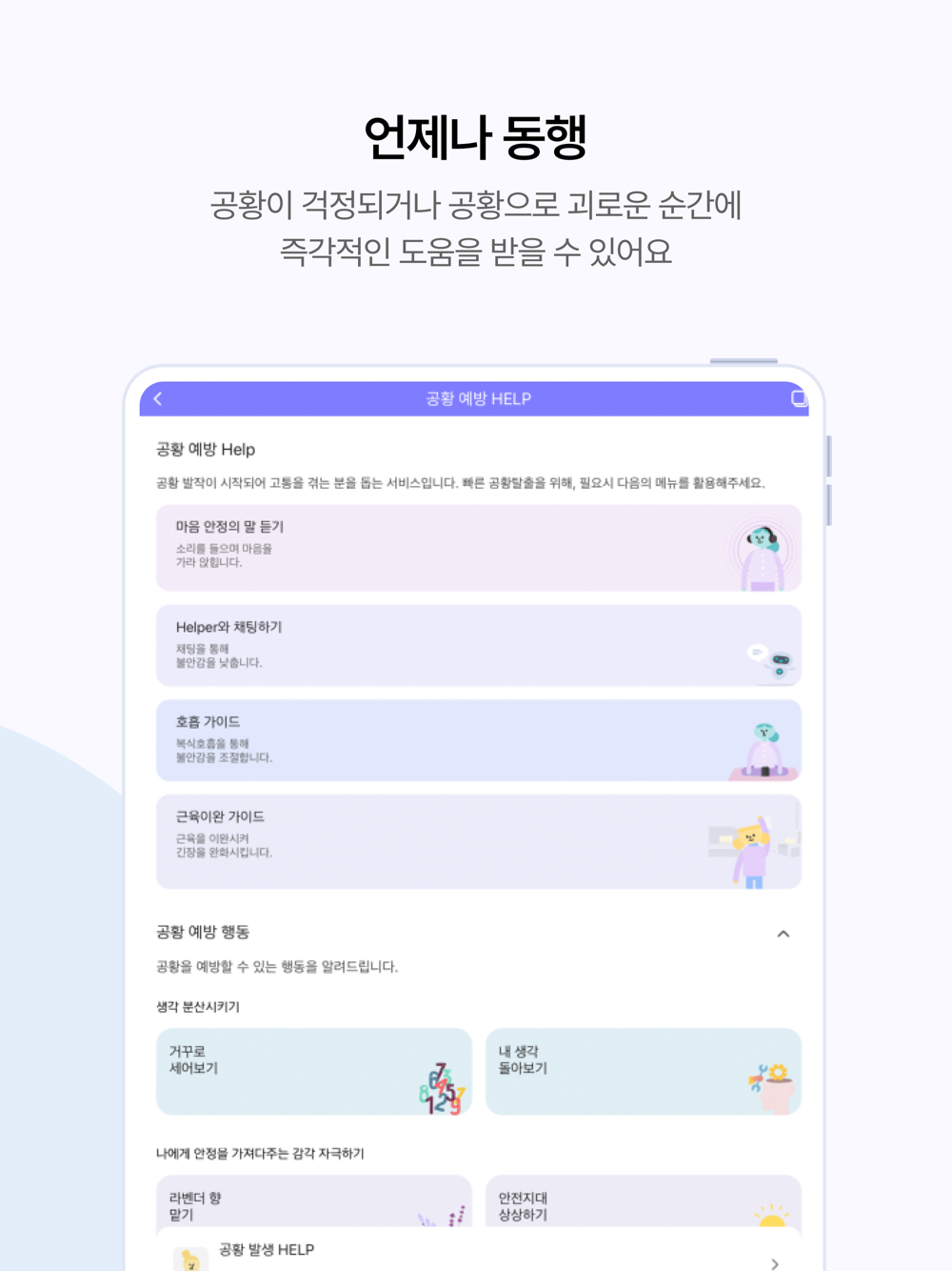 공황발작으로 인한 불안한 순간이나 괴로운 경험 시에 즉각적인 도움을 제공받을 수 있습니다. 마음을 안정시키는 각종 콘텐츠와 24/7 대화할 수 있는 챗봇을 통해 불안감을 빠르게 가라앉혀보세요.