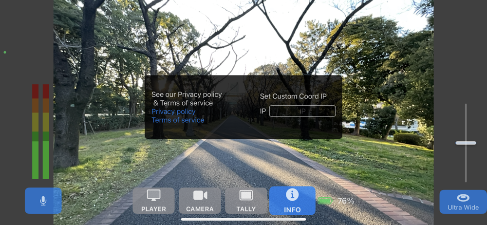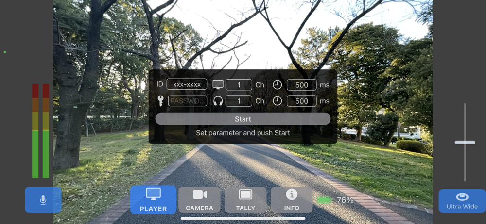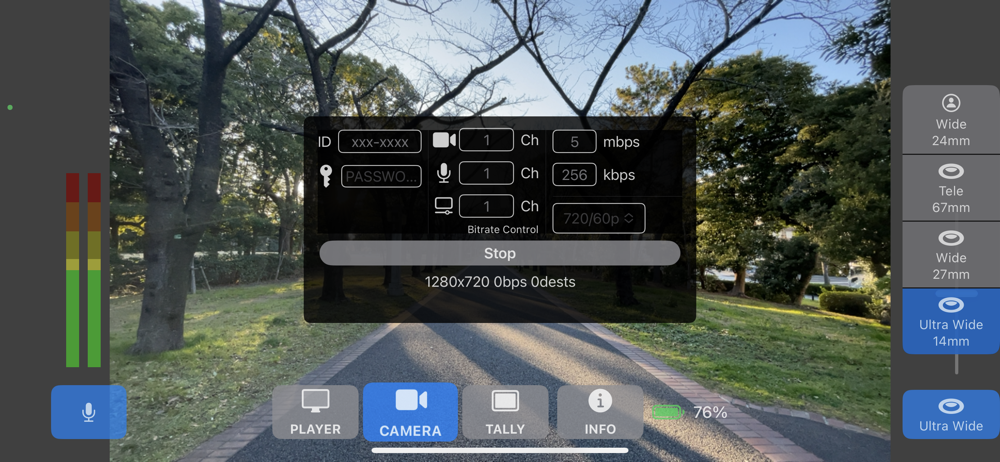 With this application, you can easily transmit live video from iPhone camera, receive video from other devices, and receive a tally light.
