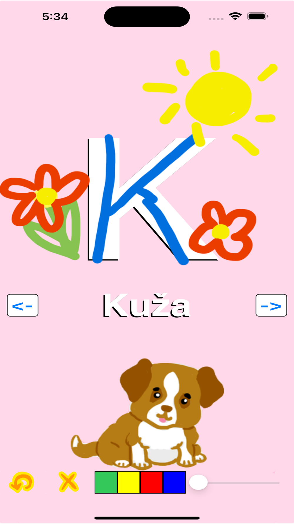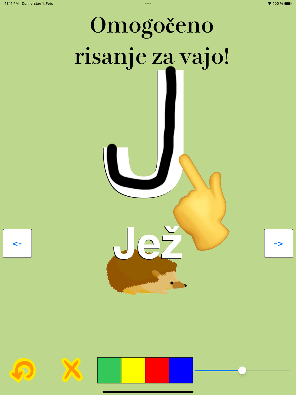 Aplikacija je zvočno podprta ter omogoča risanje s prstom po zaslonu namenjeno vadbi gibov za zapis črke. Aplikacija vsebuje poleg črke, besede, zvoka za črko in besedo tudi sličice - vse z namenom lažjega učenja abecede, saj tako črko povežemo tako z zvokom kot s sličico!