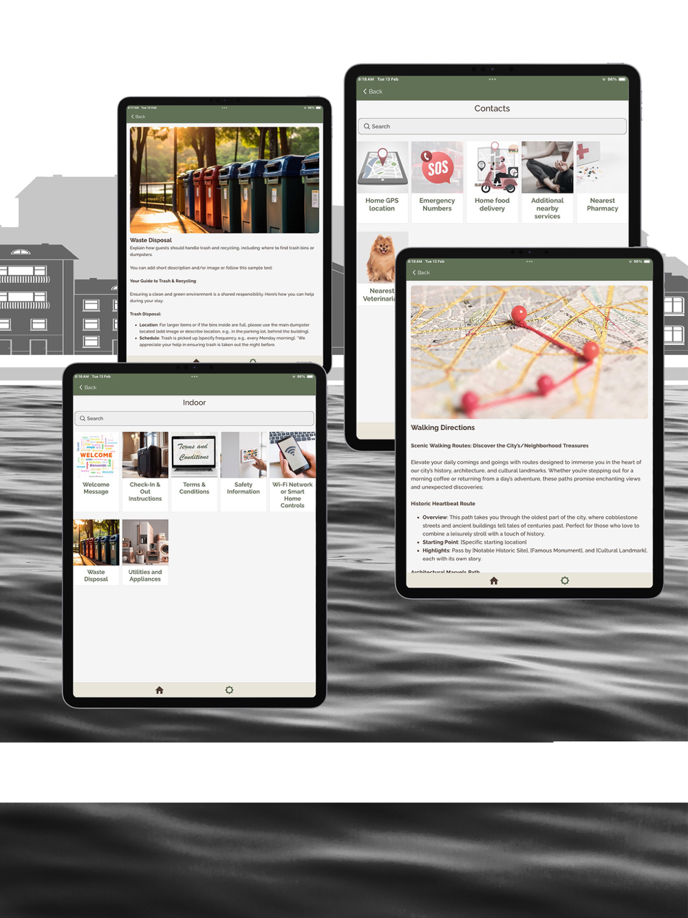 • Indoor Guidance: Seamless check-in and check-out instructions, welcoming notes, safety tips, appliences instructions and usage help, smart features, Wi-Fi, waste disposal information, and more for a hassle-free stay.