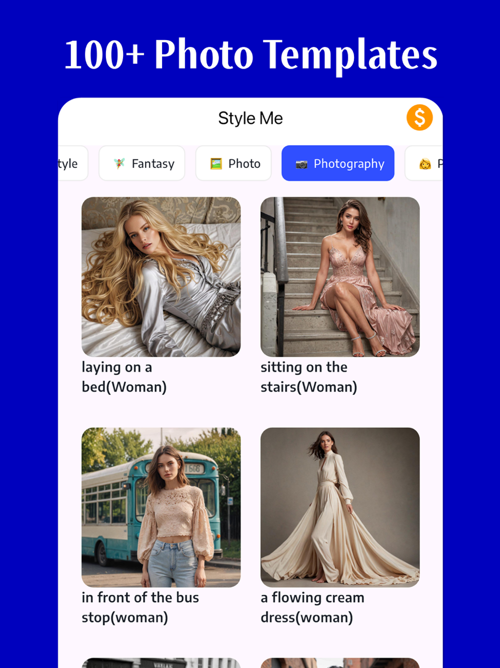 StyleMe can create an AI parallel world for you, with thousands of templates for you to choose from, enter one of your avatar photos, and generate the same photo with one click. Any AI photo you want: workplace outfits, European-style long skirts, royal style, traveling around the world, game characters, handsome suits, anime cartoons, retro cheongsam... Generate instantly! StyleMe is the mobile photo gallery on your phone.