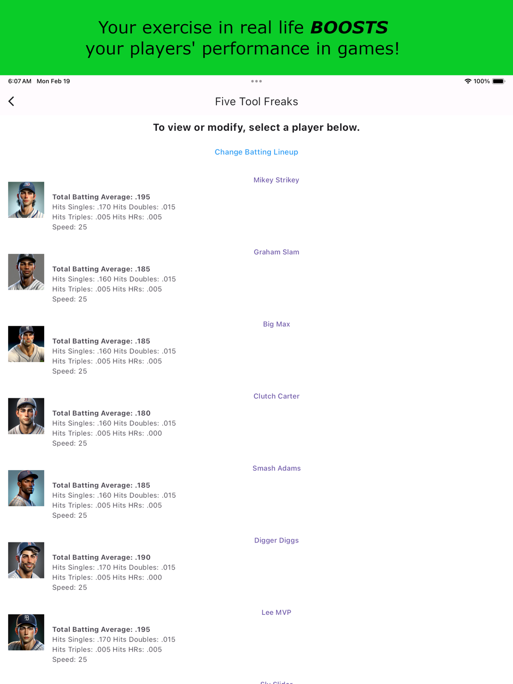Own a Baseball Team: Start with a team of players with average stats. Your physical activity is their training ground.