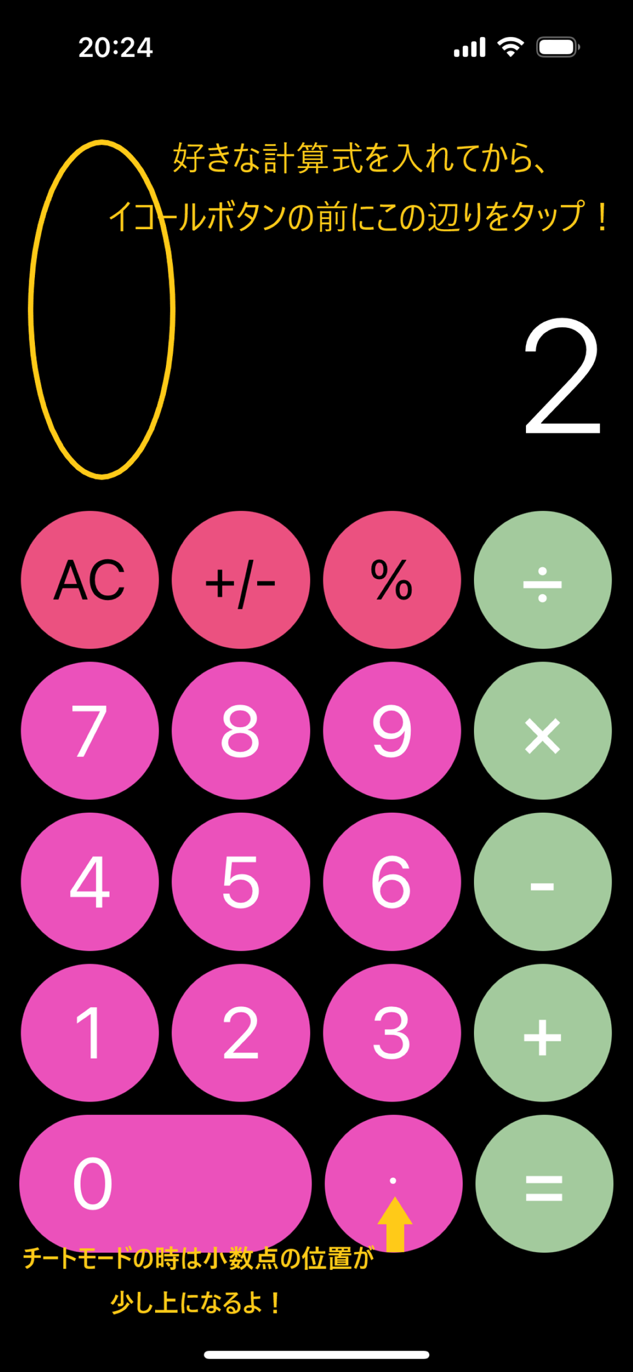 ※ 隠しボタンをタップすると「普通の計算機」と「チートモード」の切り替えができます