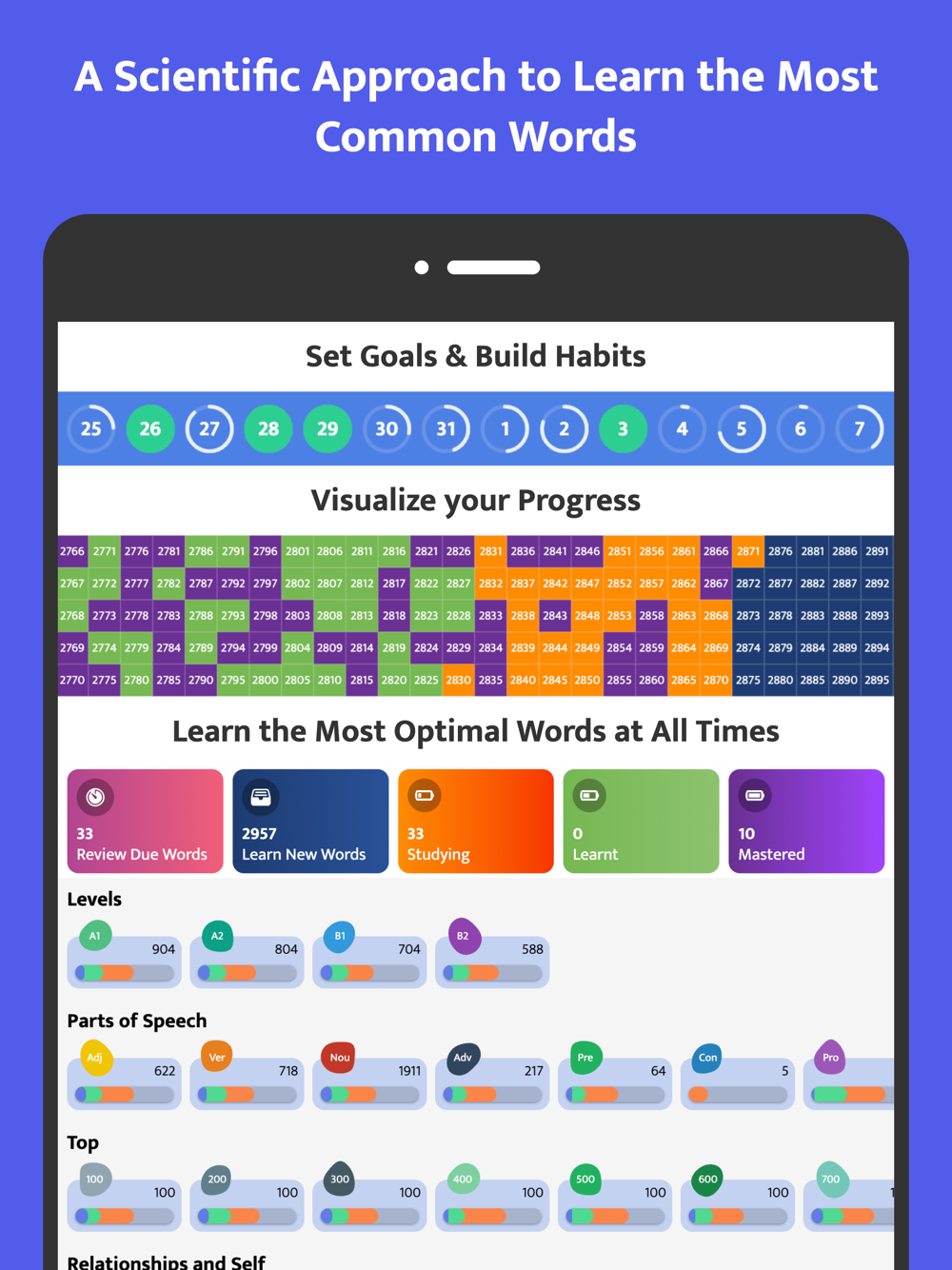 - You can understand your current study level and progress and monitor the current states of all 3000 most common words with a single glance from the main screen