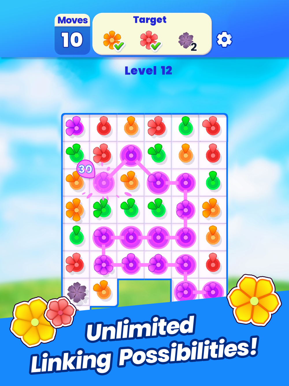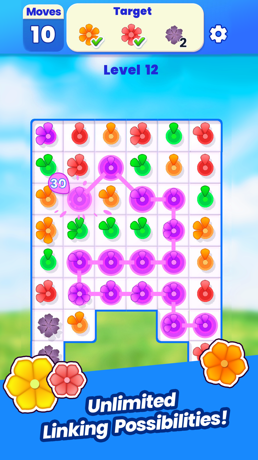 Fascinating Matching: Link petals of the same color to stack and create vibrant flowers. Achieve your bloom targets before you run out of moves.
