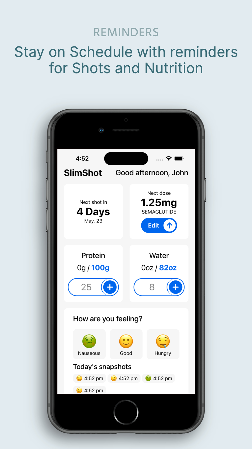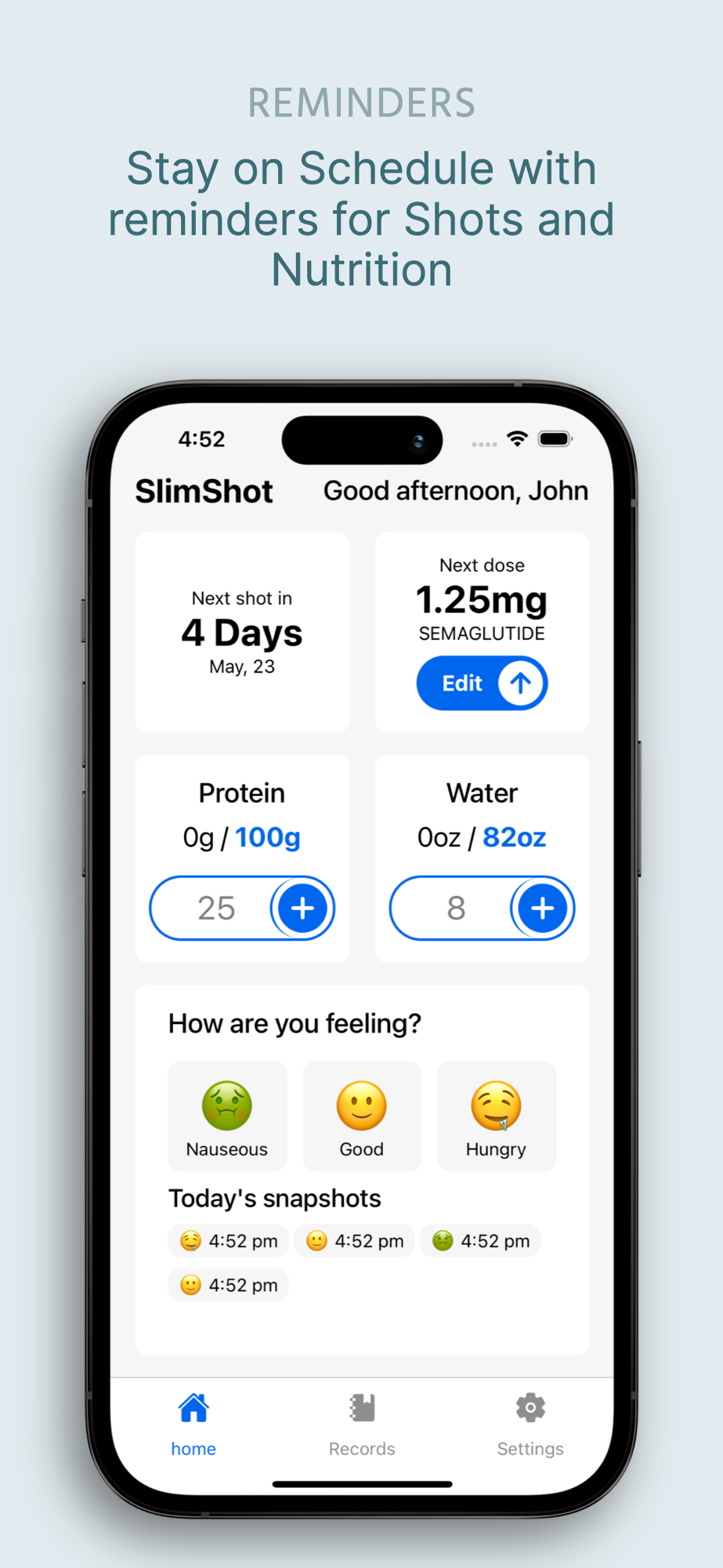 SlimShot is designed to support patients using medications like Semaglutide and Tirzepatide. Our app helps you stay on track with your medication schedule, ensuring you never miss a dose. With SlimShot, you can easily monitor your hydration and nutrition intake, which are crucial for effective weight loss.