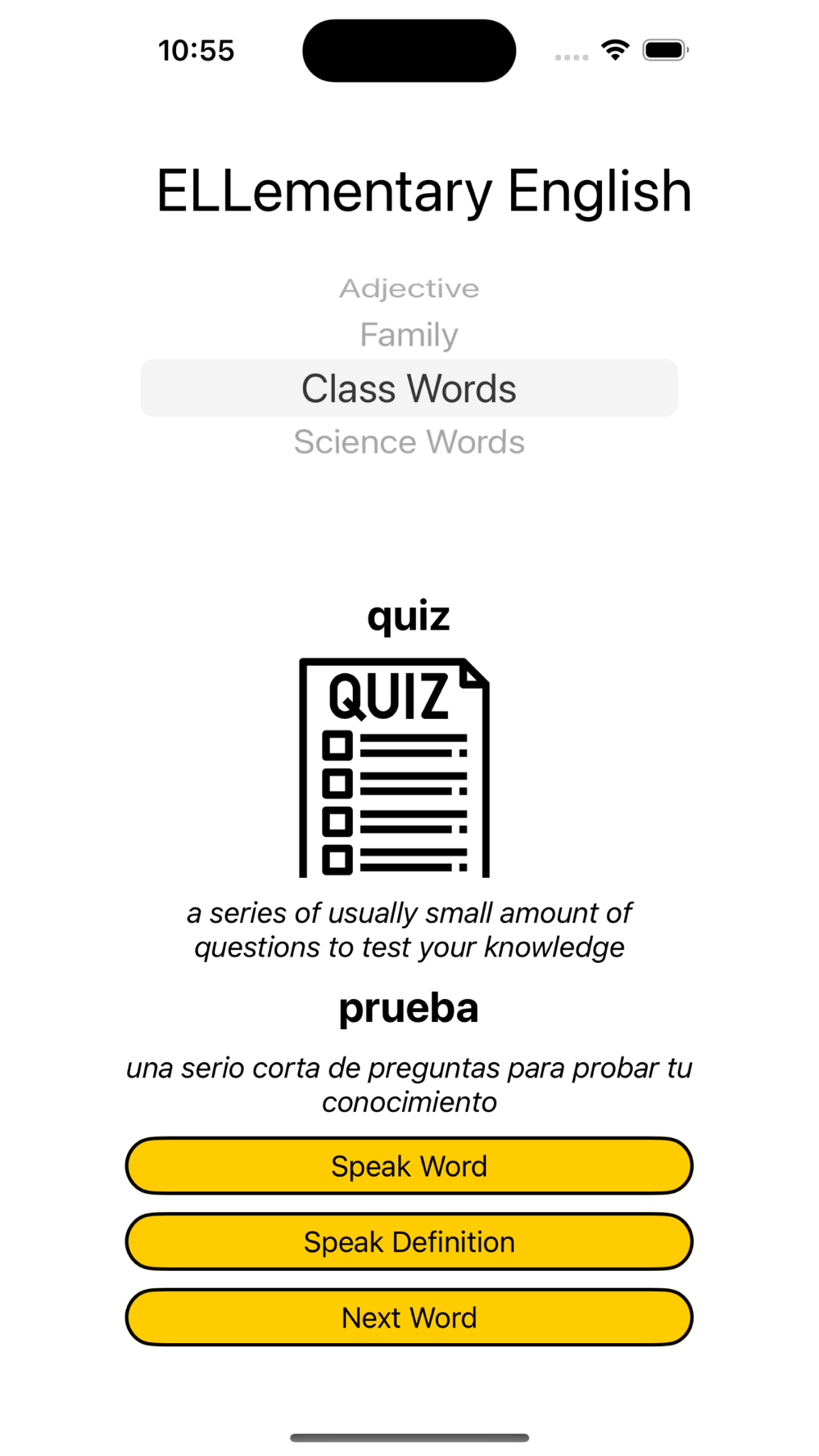 ELLementary English is created to help new english learners with very common words used on a daily basis with the english words and definitons, also the spanich words and definitons. Also equipped with speech to word, it has over 50 adjective used daily. Family names such as mother, brother, grandma, etc. We have also included words that are usually used in a classroom to help be able to navigate school.