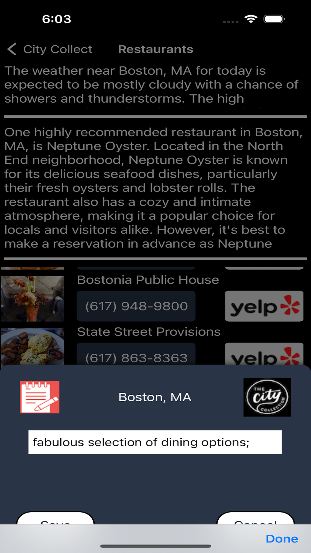 Save & retrieve notes, observations of experiences; check out options with Yelp, digital maps, contact numbers;